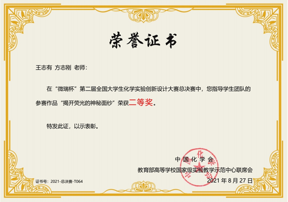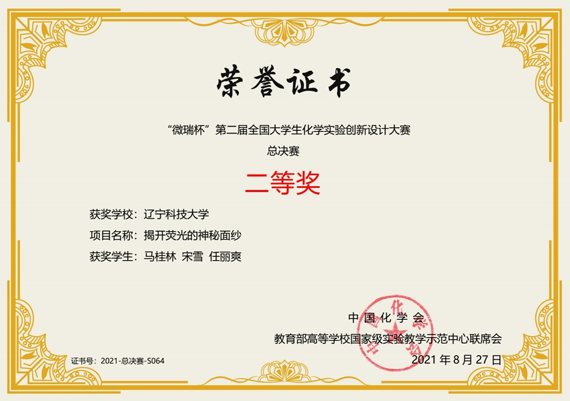 8月25日-27日,“微瑞杯”第二届全国大学生化学实验创新设计竞赛全国总决赛在青岛科技大学举行。MK体育在线(中国)唯一官方网站化学工程学院应用化学系马桂林、宋雪、任丽爽3人团队的科普实验作品“揭开荧光的神秘面纱”(指导老师:王志有、方志刚)获二等奖。