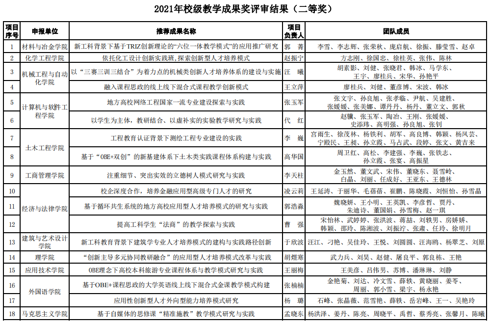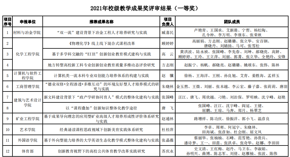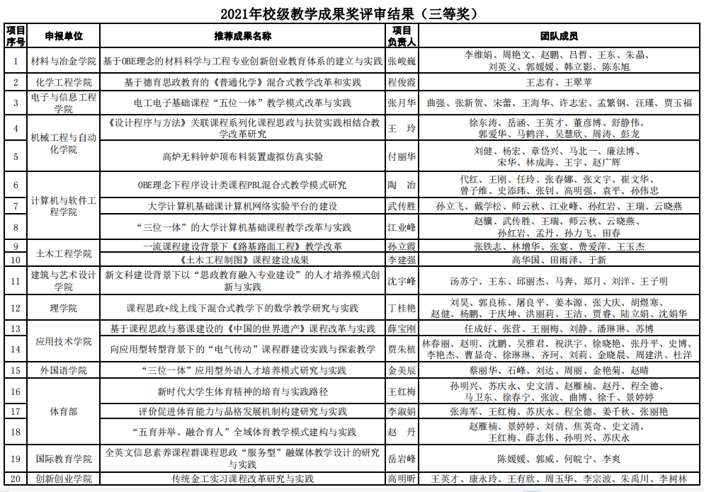 根据《关于开展MK体育在线(中国)唯一官方网站2021年教学成果奖评选工作的通知》(MK体育在线(中国)唯一官方网站教发【2021】35号)相关工作安排,各教学单位推荐参评2021年校级教学成果奖共62项。经专家评审,学校研究决定2021年校级教学成果奖获奖项目为50项,其中一等奖12项,二等奖18项,三等奖20项。获奖名单公布如下:
