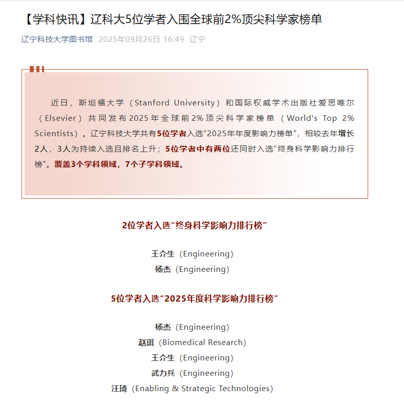 近日,斯坦福大学(Stanford University)和国际权威学术出版社爱思唯尔(Elsevier)共同发布2025年全球前2%顶尖科学家榜单(World's Top 2% Scientists)。材料与冶金学院杨杰、汪琦两位教师成功入选相关科学影响力排行榜。其中,杨杰入选“终身科学影响力排行榜”与“2025年度科学影响力排行榜”,汪琦入选“2025年度科学影响力排行榜”。