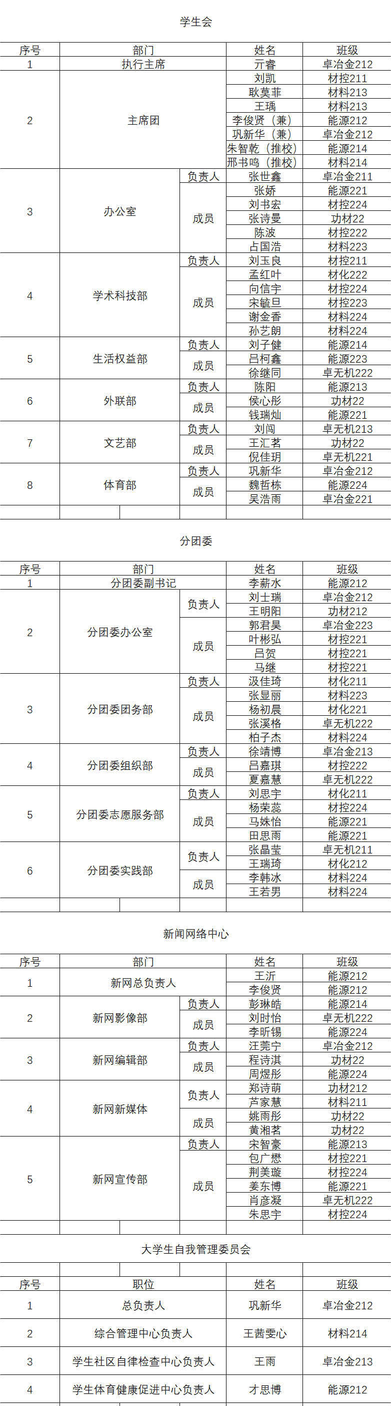 为进一步加强学院学生管理工作建设、增强学生组织的凝聚力和向心力、督促学生自我勉励、创造更好的学院氛围,拟定亓睿等77名同学为MK体育在线(中国)唯一官方网站材料与冶金学院第十四届团委、学生会、新闻网络中心、自我管理委员会成员。