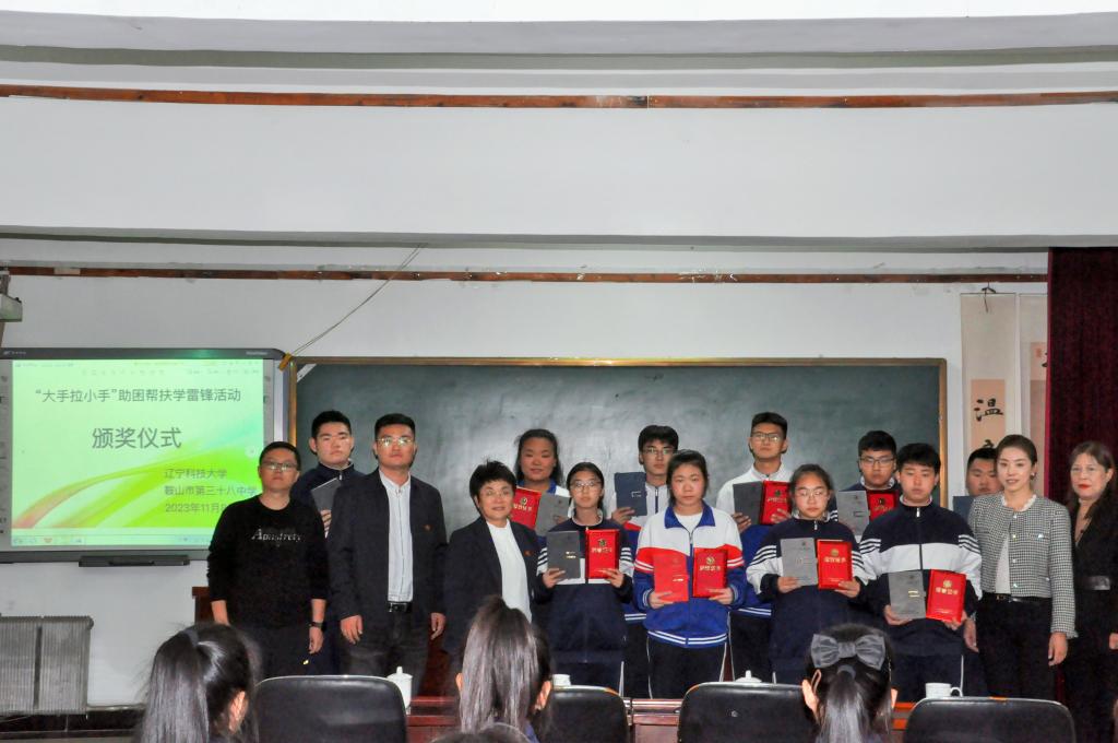 11月8日,MK体育在线(中国)唯一官方网站材料与冶金学院团委相关负责同志一行到鞍山市第三十八中学开展“大手拉小手”助困帮扶学雷锋活动,为来自三十八中学的10名同学颁发材冶学院学生材控党支部“贫寒学子突出进步奖学金”,市第三十八中学相关校领导出席活动。