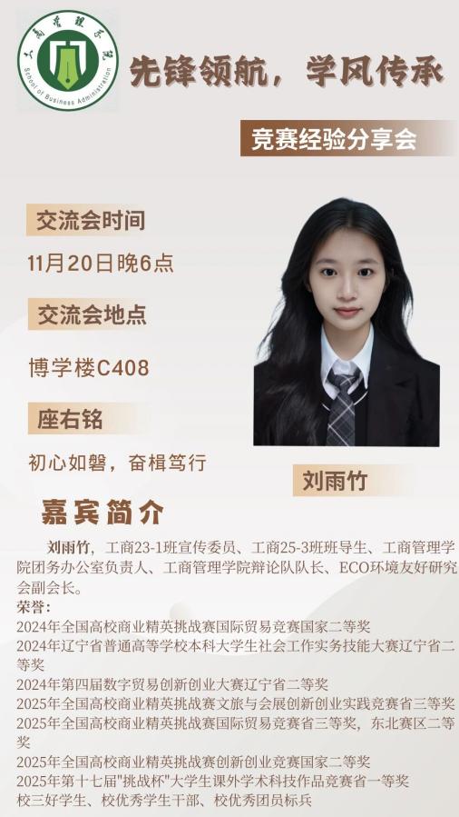 本次分享会旨在为同学们搭建与优秀学长学姐深度交流的平台,大家将近距离聆听真实鲜活的成长故事,从中学习大学阶段自我提升、实现全面发展的有效路径。期待同学们以“先锋领航,学风传承”精神为指引,以榜样为镜明方向、以奋斗为楫启新程,在追逐梦想的路上收获成长,携手共绘工商管理学院学子的青春华章。