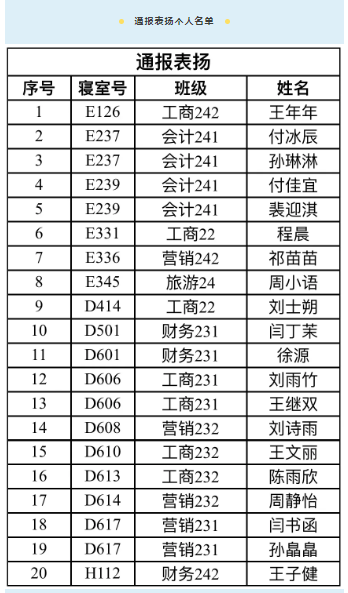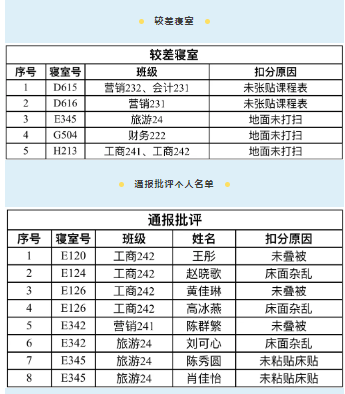 为进一步落实“三比一促一传承”“好习惯工程”工作要求,帮助同学们养成良好的生活习惯,进一步加强学生宿舍的内务建设,营造整洁舒适的居住环境,工商管理学院定期开展学生寝室内务大检查。现将检查结果通报如下:
