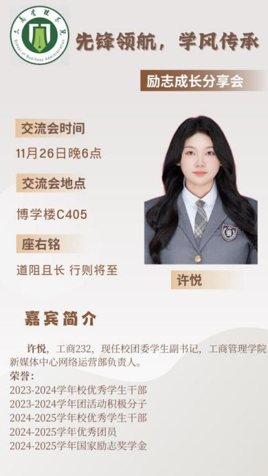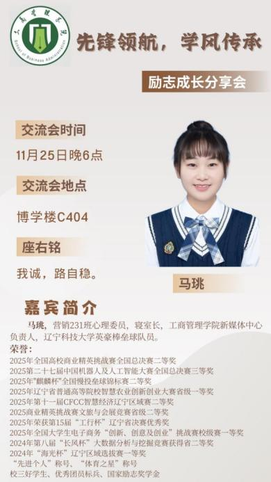 为深入践行“先锋领航,学风传承”的理念,弘扬笃学不倦、励志成长的奋斗精神,工商管理学院“先锋领航,学风传承”系列宣讲之“励志成长分享会”将于11月25日、26日举行。本次活动特邀两位国家励志奖学金获得者,与同学们分享他们在求学与实践道路上坚守初心、迎难而上的励志故事与成长智慧。