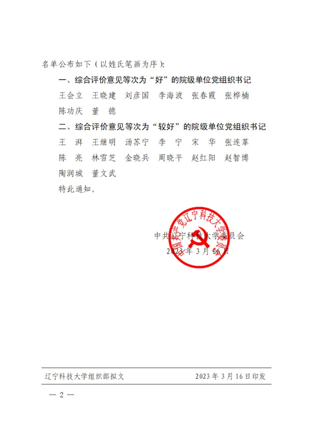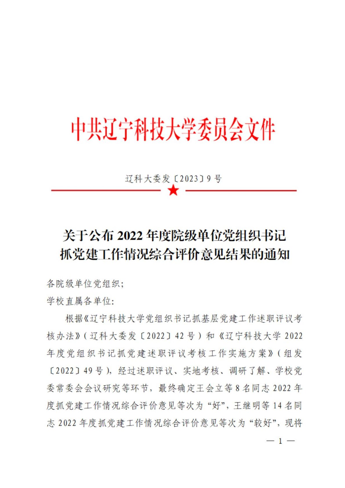关于公布2022年度院级单位党组织书记抓党建工作情况综合评价意见结果的通知