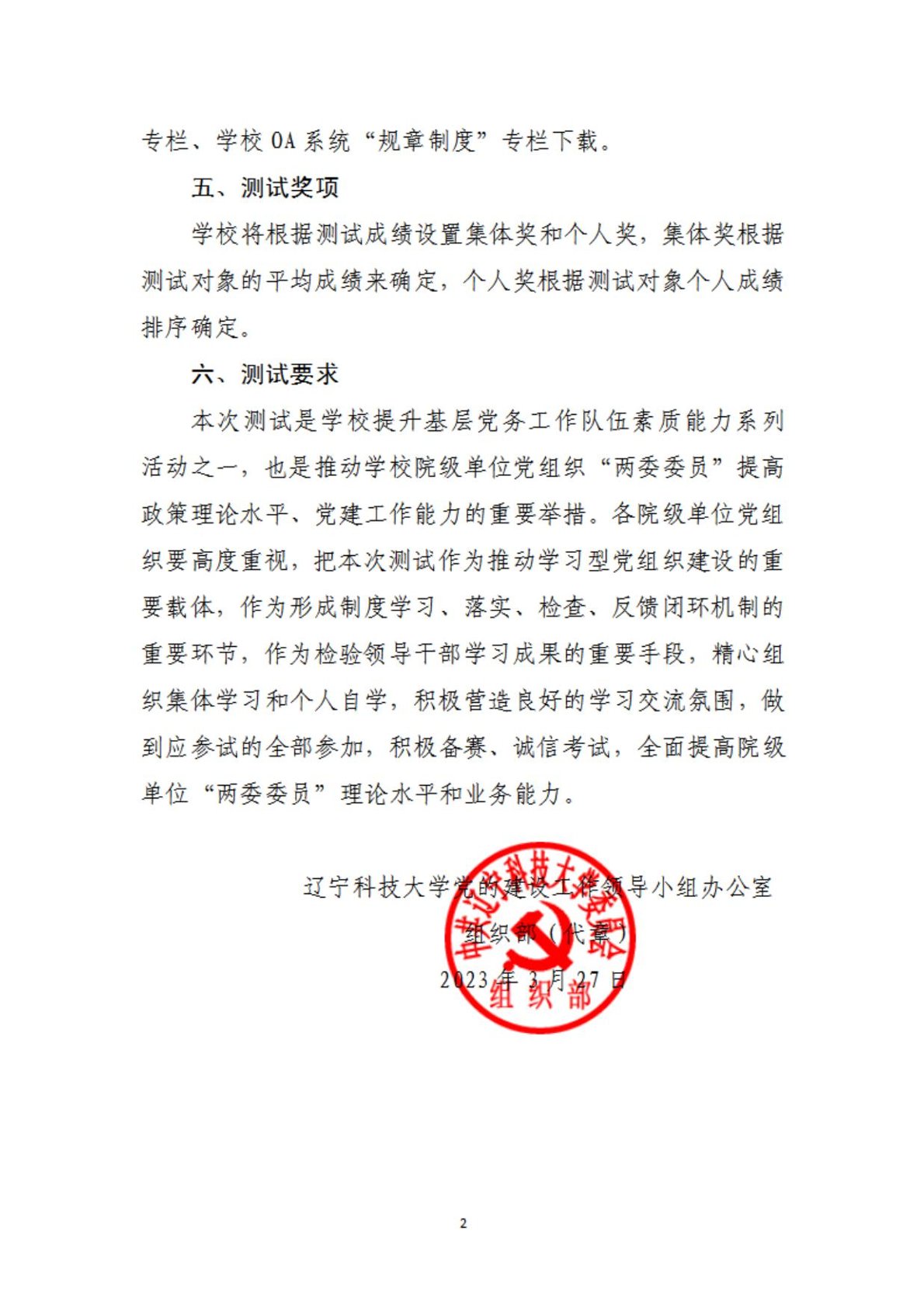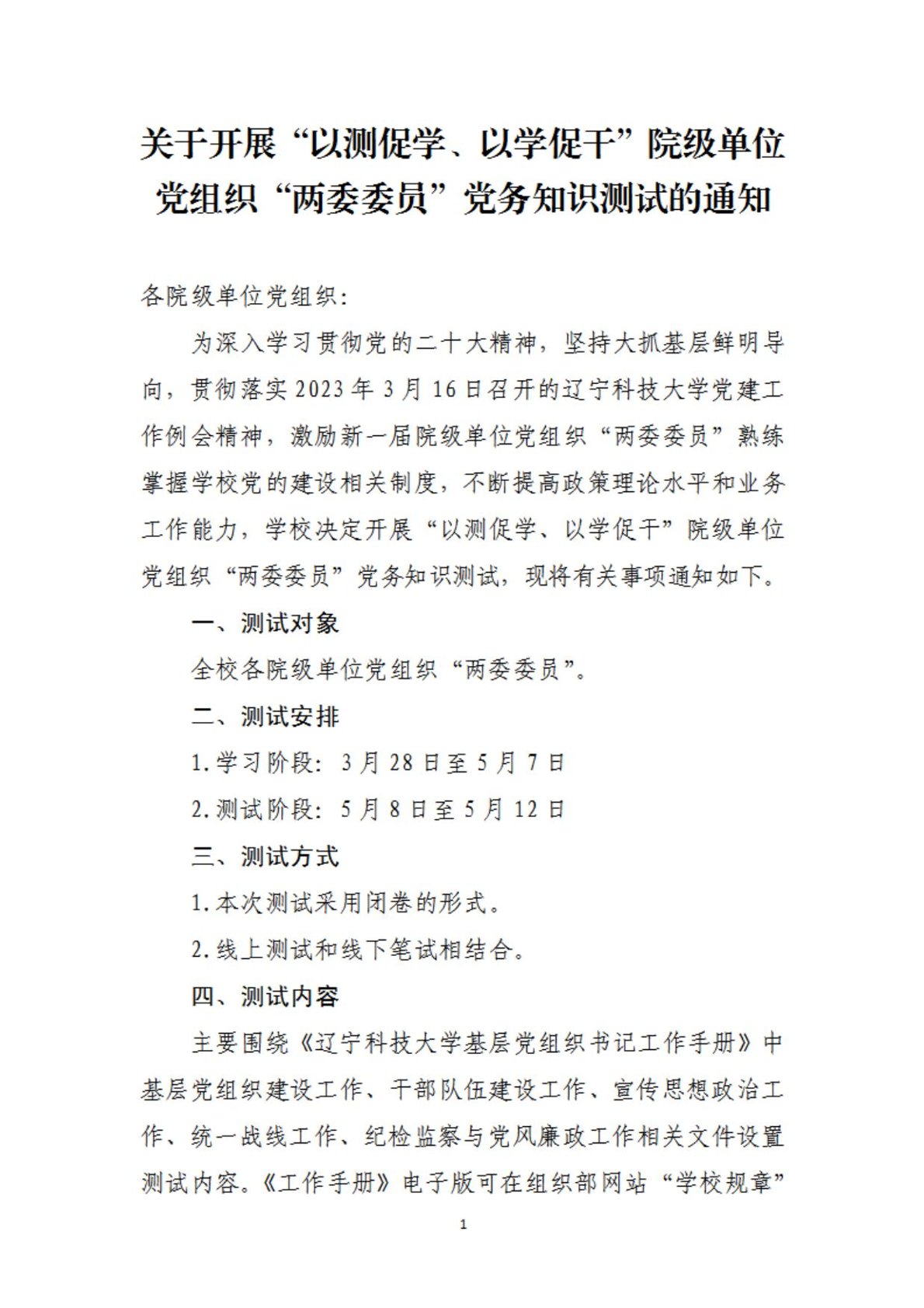 关于开展“以测促学、以学促干”院级单位党组织“两委委员”党务知识测试的通知