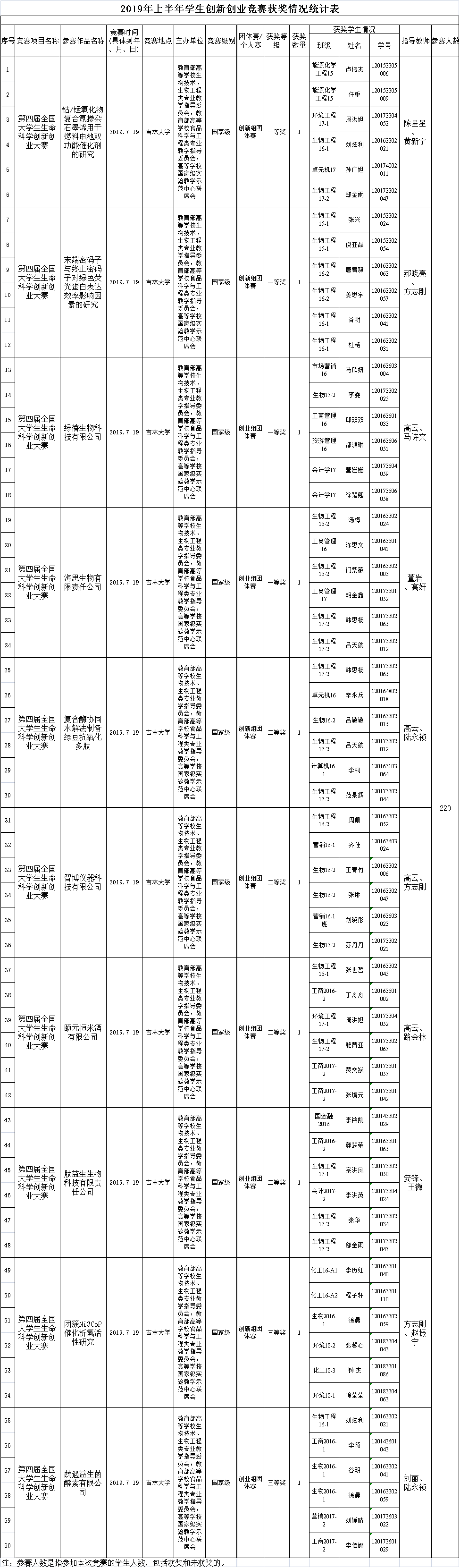 化工学院2019年上半年学生创新创业竞赛获奖情况统计表