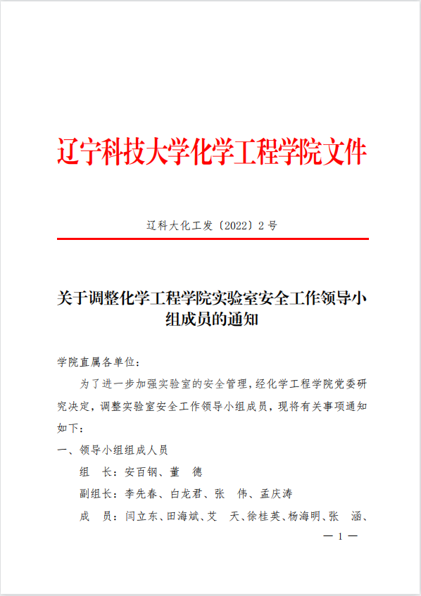 关于调整化学工程学院实验室安全工作领导小组成员的通知
