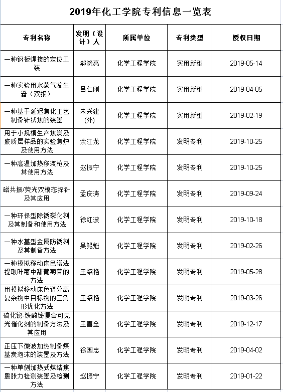 2019年化学工程学院专利成果汇总