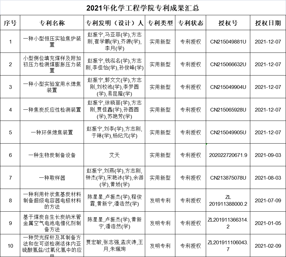 2021年化学工程学院专利成果汇总
