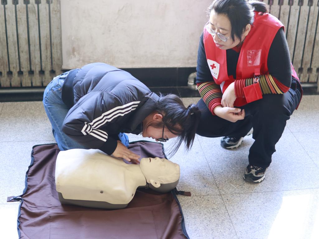 红十字会胡老师与同学们分享了志愿者们在生活中遇到的应急救护经历,她指出,不一定每一次的心肺复苏都能把人救回来,但如果不做那就100%救不回来了。胡老师为大家详细讲解了在遇到他人心脏骤停忽然倒地时,我们应该采取的急救措施步骤和动作要领等。她呼吁参会师生要认真学习本次培训知识,如遇突发情况,可以在黄金四分钟内拯救宝贵的生命。在互动环节,同学们被分成了四组,由4位红十字会老师一人带领一组亲自示范正确的心肺复苏措施,并在示范中详细讲解动作要领,要一听二看三感觉,第一听被救助人有没有呼吸,第二看被救助人口腔里是否有异物,第三感觉胸肺是否有起伏。同学们依次亲身实践,各位老师现场指导并纠正了同学们错误的动作。