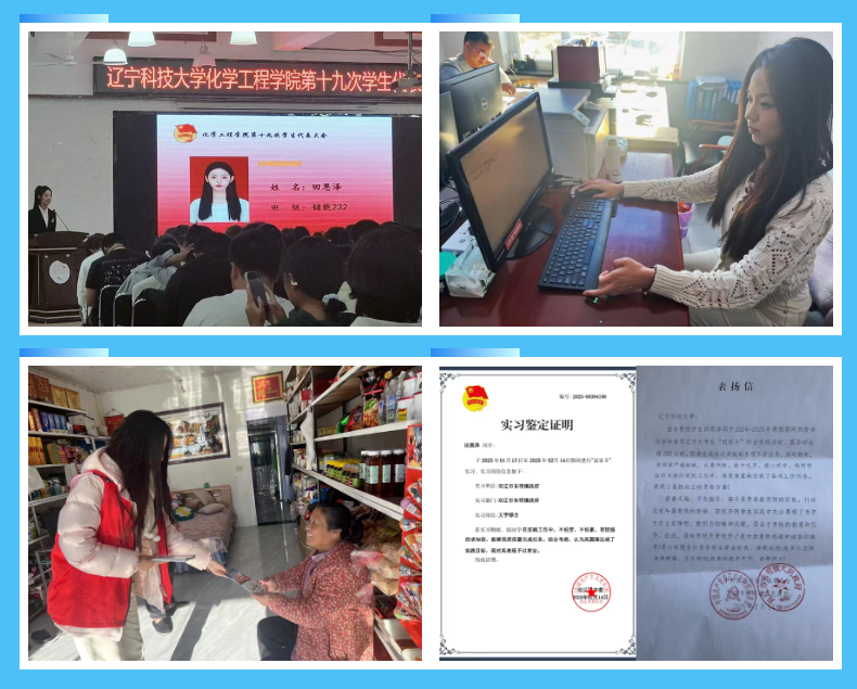 田恩泽,女,共青团员,储能科学与工程23-2班学生。2024年寒假期间,该生走进群众,深入基层,在双辽市东明镇政府社区实习期间,主要负责文字起草,分发手册,体检志愿者,辅导托管班儿童等工作。
