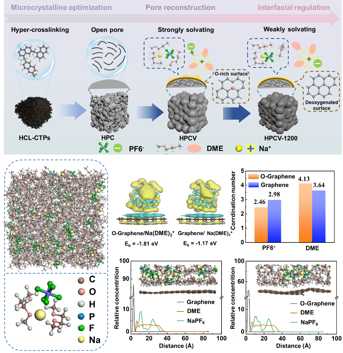该研究以煤焦油沥青为研究对象,通过分子交联耦合化学气相沉积(CVD)及后续热处理的策略,实现了对煤焦油沥青(CTPs)基硬碳材料中闭孔结构的可控构筑以及电极/电解液界面的优化,上述结构-界面的双重分子调控策略共同促成了91.6%的高初始库伦效率(ICE),并在0.2 A/g电流密度下循环200圈侯,仍具有320.6 mAh/g的比容量,10A/g电流密度下具有112.6 mAh/g的比容量,该策略系统解决了沥青基硬碳在高初始库伦效率与快充性能之间的矛盾,实现了高能量密度与快充兼容性。