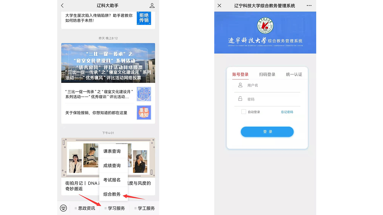 1.点击下方菜单栏中的“学习服务”,再点击“课表查询”“成绩查询”。