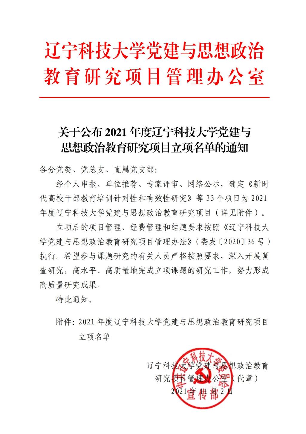 关于公布2021年度MK体育在线(中国)唯一官方网站党建与思想政治教育研究项目立项名单的通知.pdf