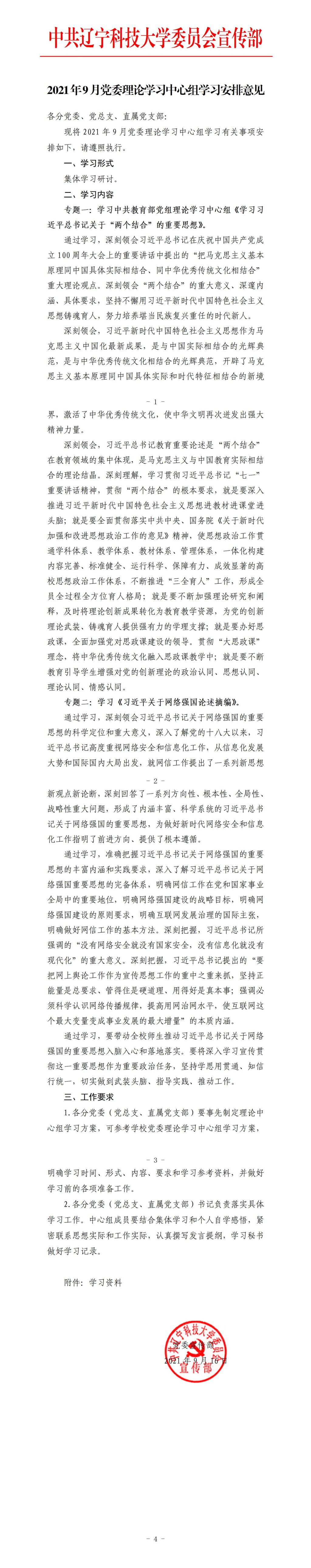 2021年9月党委理论学习中心组学习安排意见