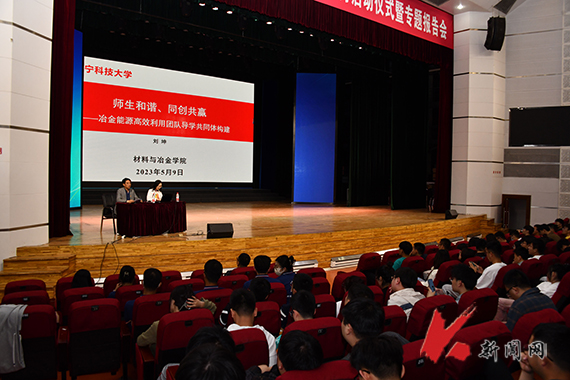 启动仪式后,材料与冶金学院博士生导师、第二届研究生“优秀导学团队”冶金能源高效利用导学团队负责人刘坤教授作专题报告。刘坤从学校、学院和专业概况出发,以冶金能源高效利用团队导学共同体构建为例,用一个个生动的实例,阐明了新时代研究生要有理想有追求、要耐得住寂寞、要有团结协作精神、要有规划、要坚守诚信科研、要学会感恩,并激励研究生要勇担时代使命和历史责任,努力成为严谨治学、勇攀高峰、科研报国的新时代研究生。
