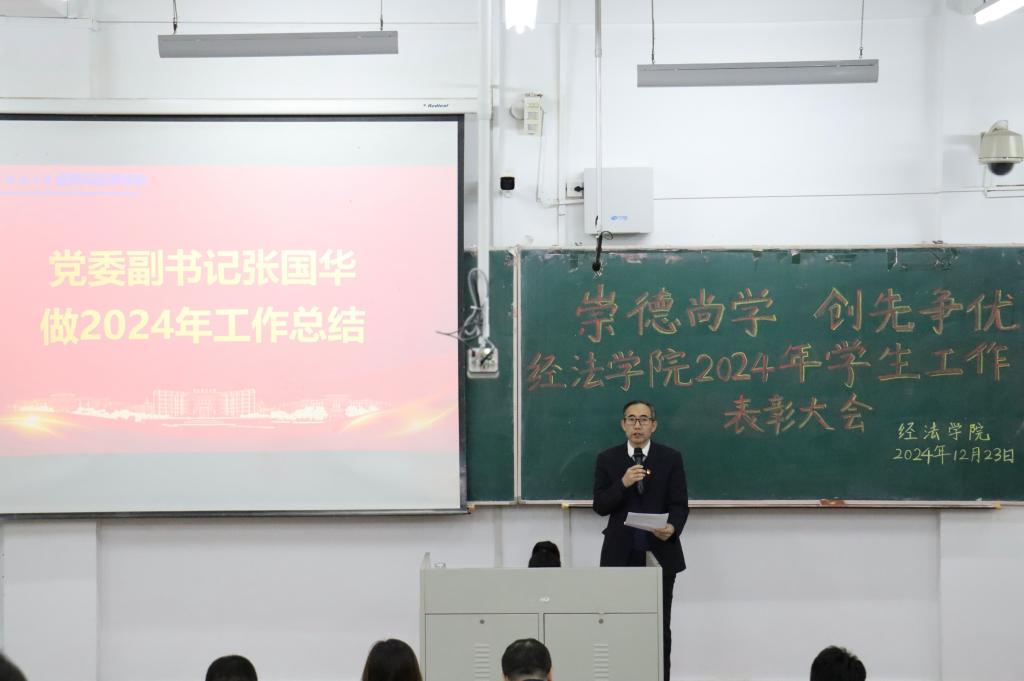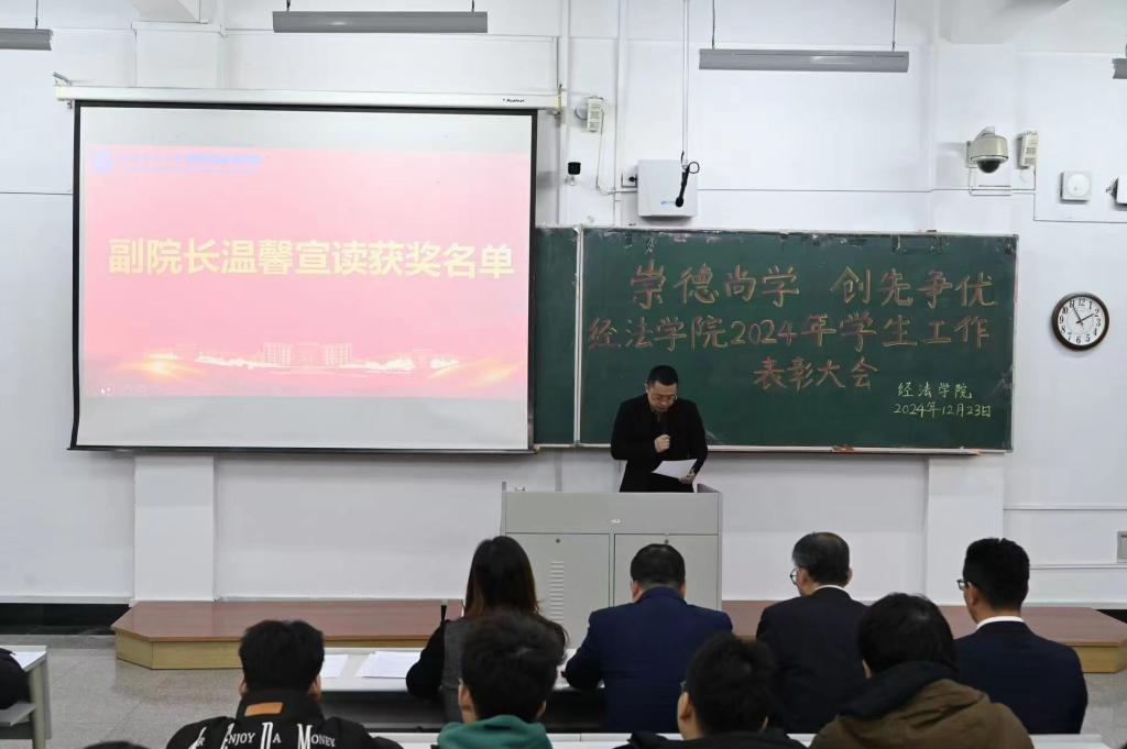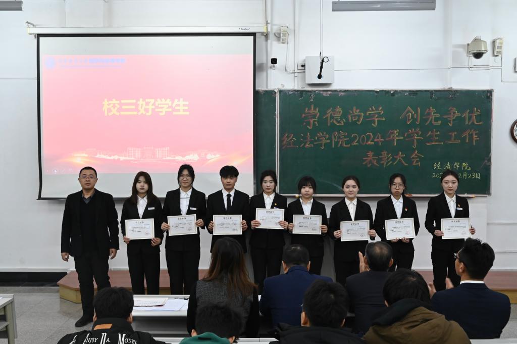 12月23日,经法学院于博学楼A101召开“崇德尚学 创先争优”2024年学生工作表彰大会。会议由学院党委书记赵智博主持,学院领导、各系主任、班主任、辅导员、获奖学生代表及2024级全体学生参加。
