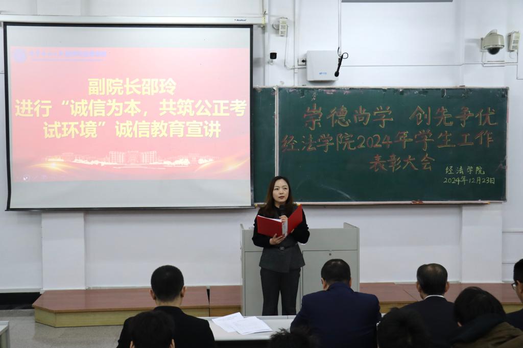 颁奖仪式后,学生代表赵心豪上台分享学习心得、成长经历与社会实践感悟。随后,副院长邵玲开展诚信教育宣讲,强调诚信在大学生成长成才过程中的重要性,介绍学院在诚信教育方面的一系列举措和制度,并列举实例,呼吁学生树立正确的诚信观。最后,学院院长郭浩淼作大会总结。他对全体师生一年来的辛勤付出表示衷心感谢,对学院未来的发展提出期望和要求,激励全院师生积极进取、追求卓越,推动学院各项事业蓬勃发展,共同书写经法学院更加辉煌的新篇章。获奖同学纷纷表示,将以更高的标准要求自己,勇攀高峰;其他同学将以他们为榜样,不懈努力奋斗,奋起直追。