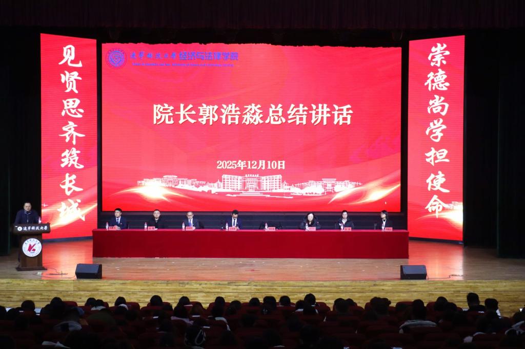 12月10日,经法学院在校礼堂隆重举行2025年度学生工作表彰大会。会议由经法学院党委书记赵智博主持,院长郭浩淼、党委副书记张国华、副院长邵玲、副院长温馨、金融科技系主任郭威、学办主任李路云、团委书记张鹏飞及2023、2024、2025级全体学生参加。