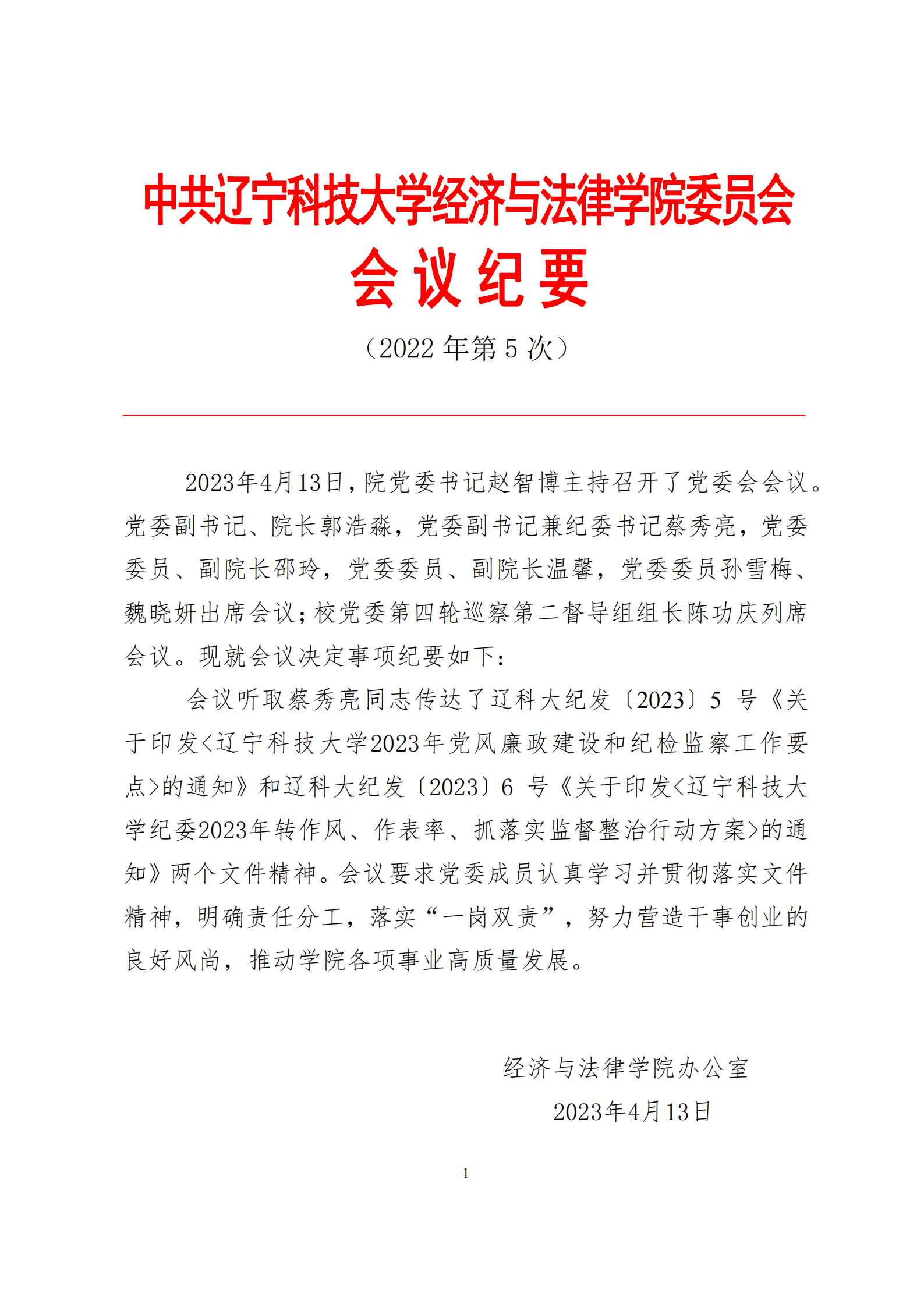 中共MK体育在线(中国)唯一官方网站经济与法律学院委员会会议纪要(2023年第5次)