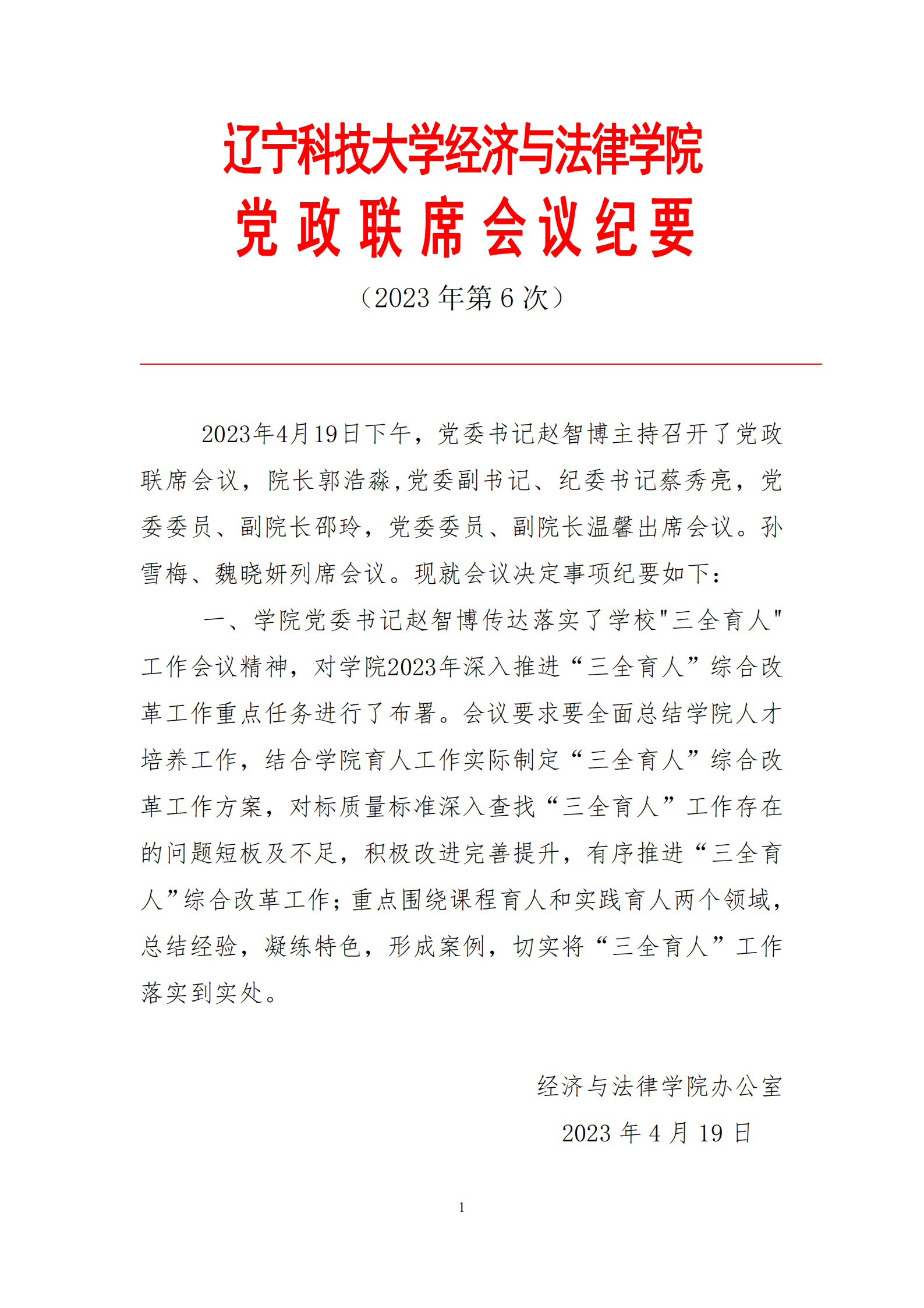 MK体育在线(中国)唯一官方网站经济与法律学院党政联席会会议纪要(2023年第6次)