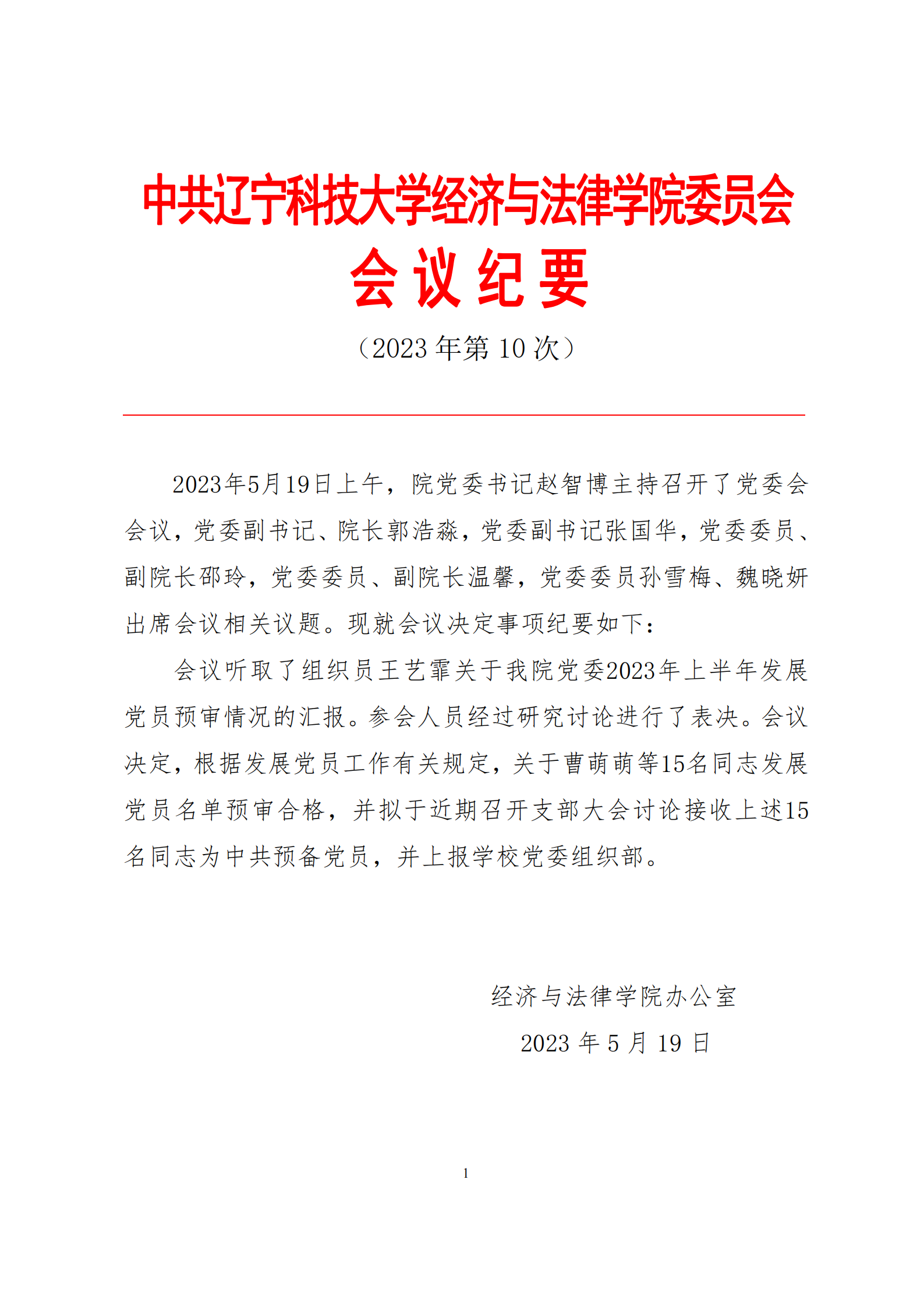中共MK体育在线(中国)唯一官方网站经济与法律学院委员会会议纪要(2023年第10次)