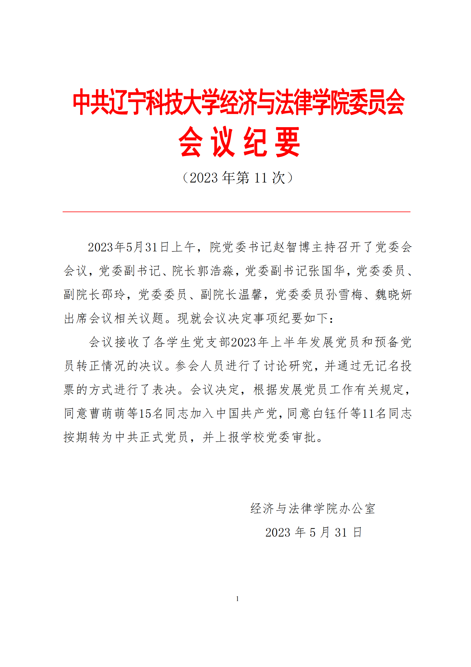 中共MK体育在线(中国)唯一官方网站经济与法律学院委员会会议纪要(2023年第11次)