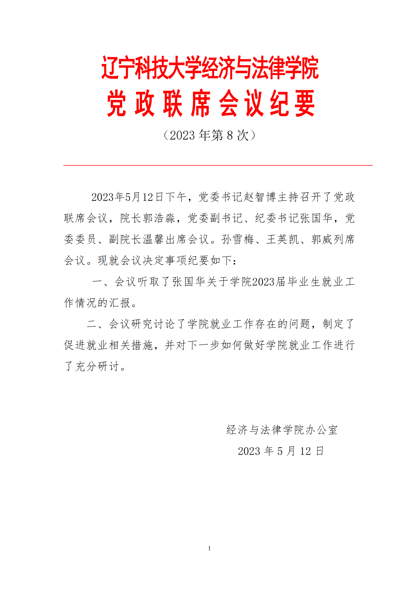 MK体育在线(中国)唯一官方网站经济与法律学院党政联席会会议纪要(2023年第8次)