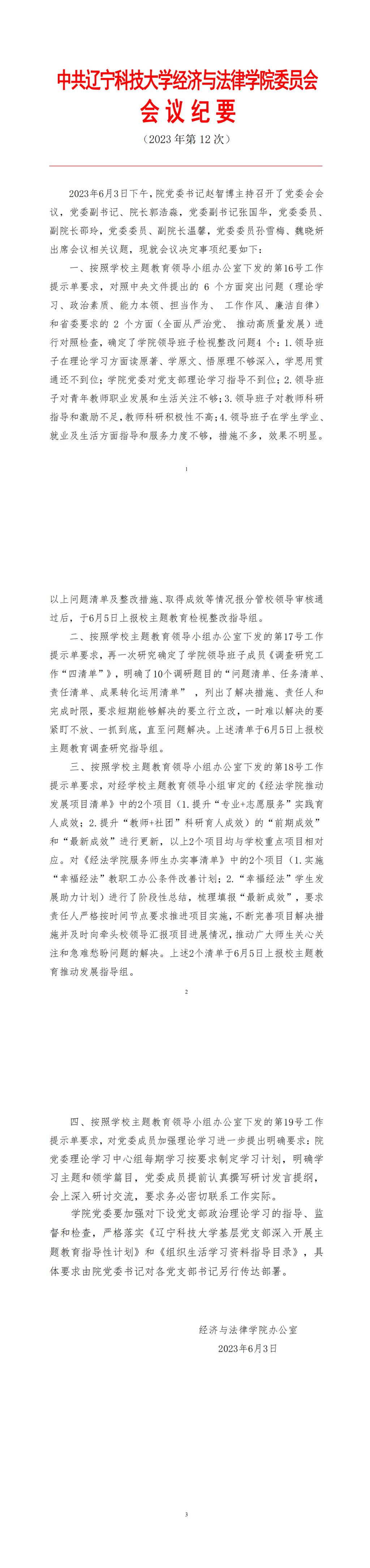中共MK体育在线(中国)唯一官方网站经济与法律学院委员会会议纪要(2023年第12次)