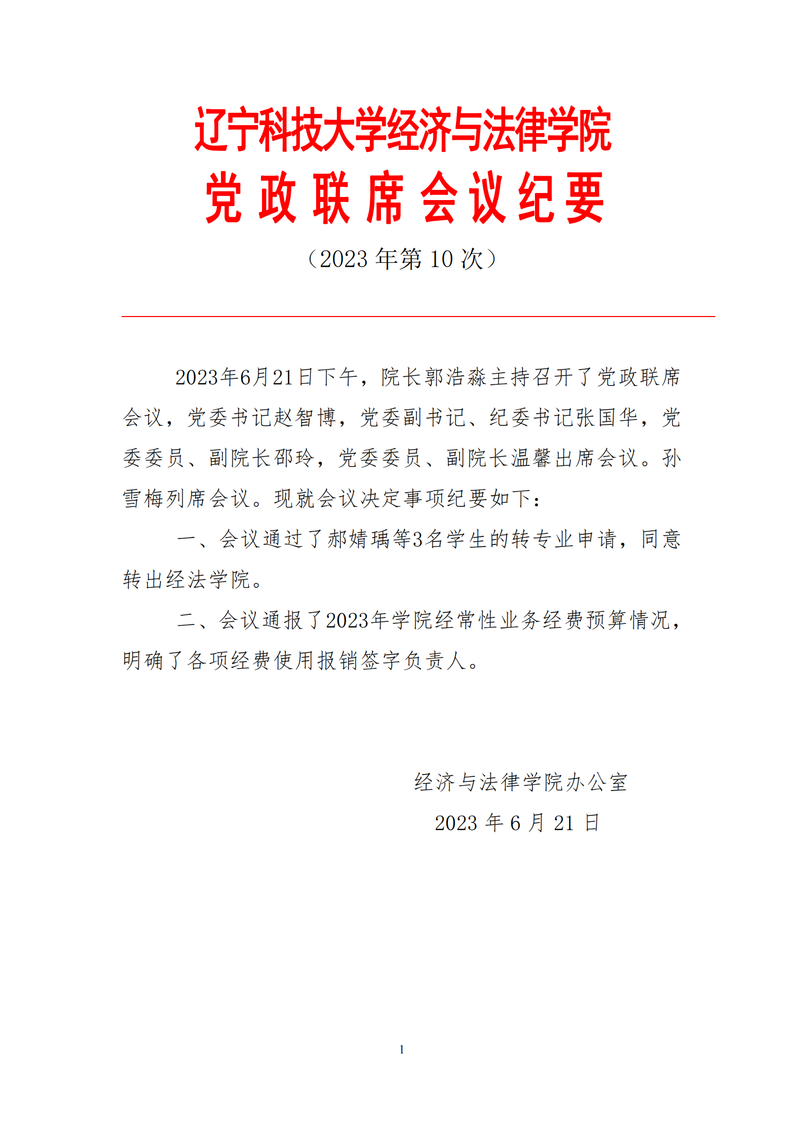 MK体育在线(中国)唯一官方网站经济与法律学院党政联席会会议纪要(2023年第10次)