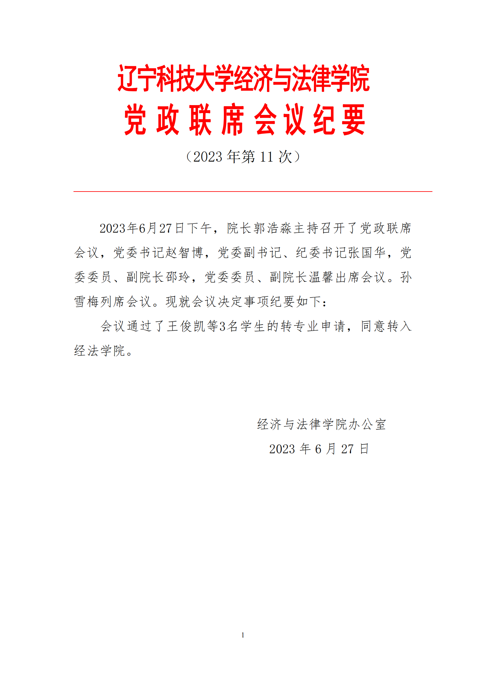 MK体育在线(中国)唯一官方网站经济与法律学院党政联席会会议纪要(2023年第11次)