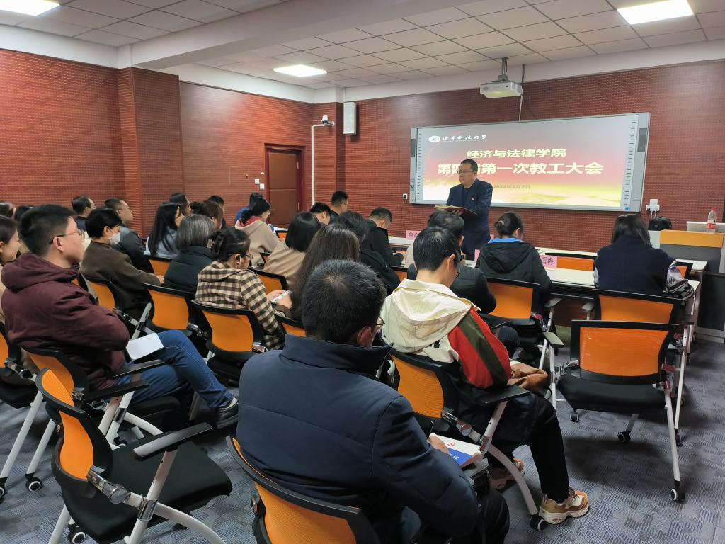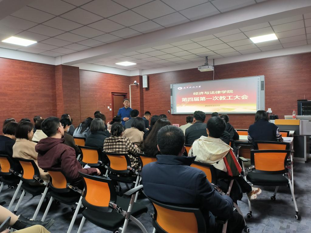 2023年3月7日下午,经济与法律学院在5号楼A407会议室召开第四届第一次教职工暨工会会员大会。会议由院工会主席刘振竚主持,全院教职工出席,校工会主席鲁焱应邀列席。