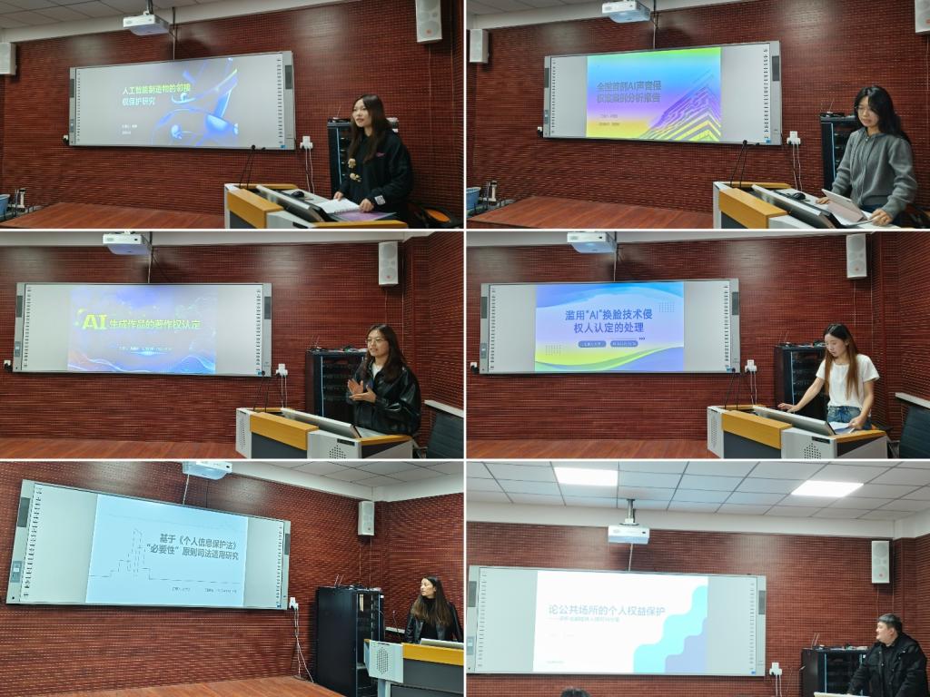 报告会紧扣大数据与人工智能时代法治建设新命题,以案例分析为核心载体,聚焦民商法、经济法、知识产权法等领域的新兴热点问题。15名汇报学生依次登台,通过PPT直观呈现研究背景、核心论点与论证逻辑,展现出扎实的专业功底、敏锐的学术视角与主动探究的科研态度。评委团围绕选题价值、研究方法、论证严谨性及汇报表达等维度精准点评,既充分肯定研究亮点,也针对性提出优化建议,为同学们后续科研工作提供了切实指导。现场互动环节氛围热烈,参会学生积极交流探讨,进一步深化了学术认知。