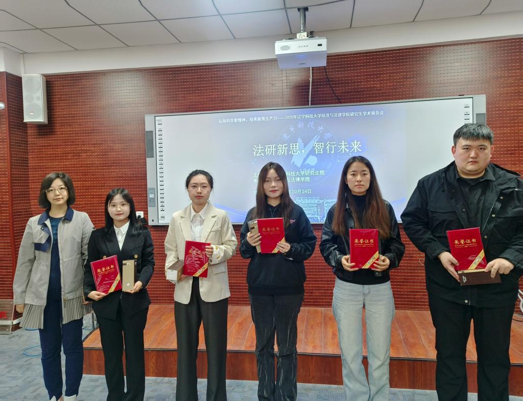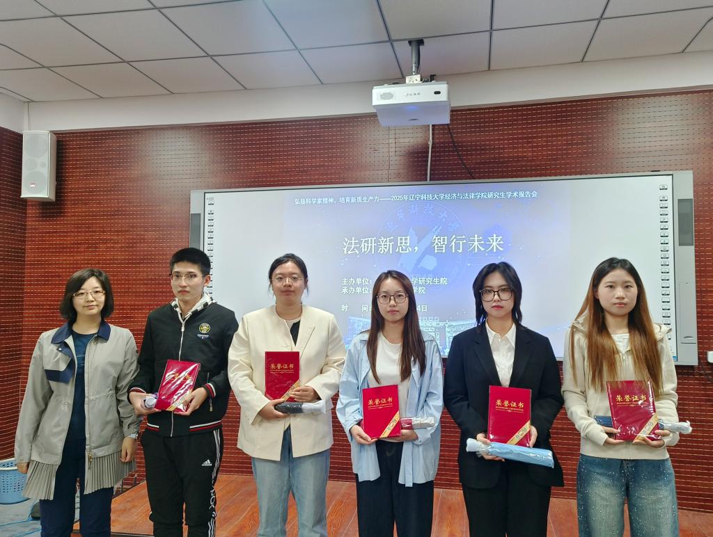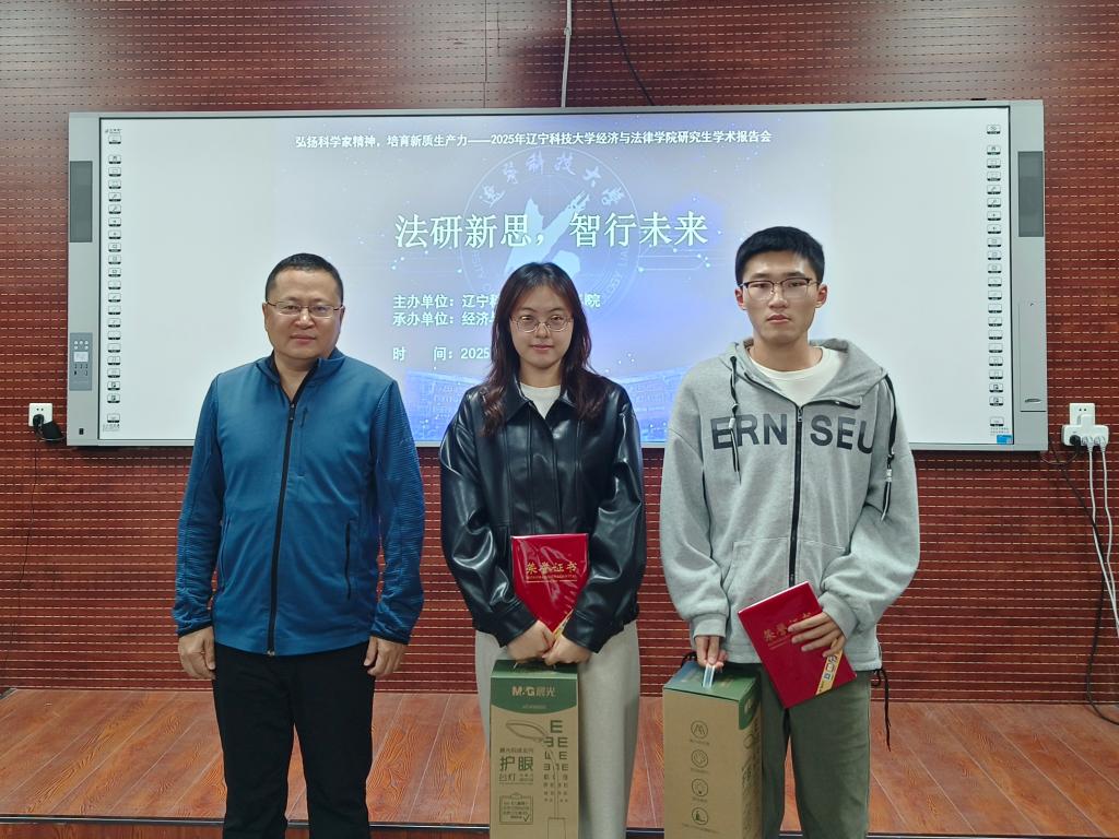 报告与讨论环节结束后,评委现场打分并揭晓获奖名单,共评选出一等奖 2 名、二等奖 3 名、三等奖 5 名及优秀奖 5 名。经法学院院长郭浩淼与评委老师共同为获奖学生颁发荣誉证书及奖品,鼓励同学们以此次报告会为契机,持续深耕学术、勇攀高峰。参会同学纷纷表示,此次活动为大家提供了宝贵的学术展示与交流机会,不仅拓宽了学术视野,更激发了主动探索的科研热情,实现了从“旁观学习” 到“主动钻研”的思维转变。