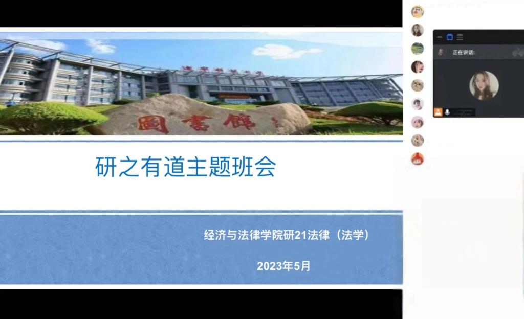 5月26日至29日,经法学院各年级研究生以线上线下相结合的方式召开“研之有道”主题班会,班会由各班班长主持。
