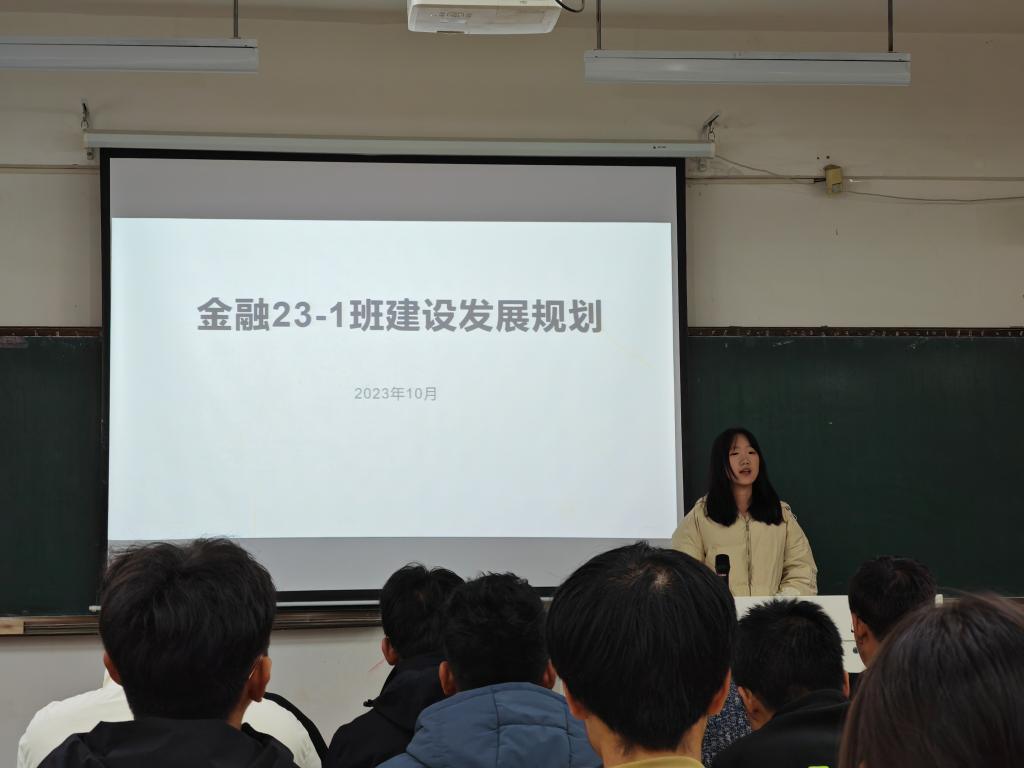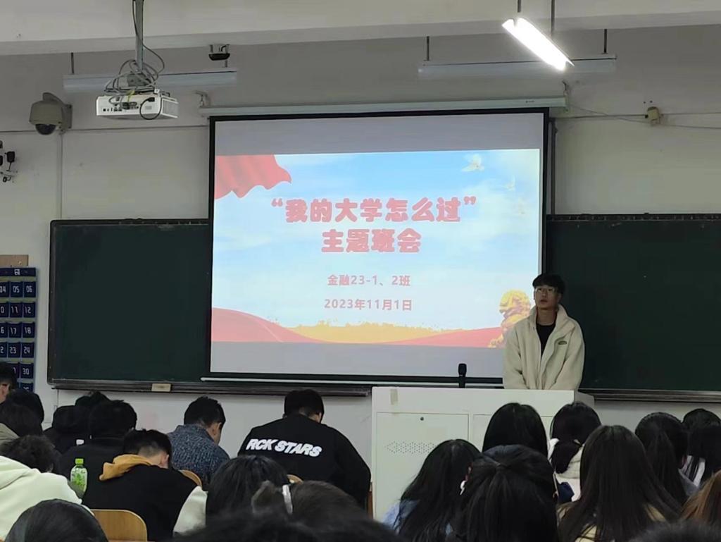 班会伊始,辅导老师首先说明了召开班会的目的,就是要让每个班级和每一名同学都尽快找到并确立自己的发展目标和努力方向。今年6月刚刚毕业的金工19张添皓、国贸19贾浩楠、金融19唐文萍、法学19王雨杰等优秀本科毕业生代表通过视频的方式,分享了自己四年大学生活的经验,并在思想、学习和生活等方面对2023级学弟学妹提出了切实可行的指导意见和建议。各新生班班长在前期精心准备的基础上,展示了班级建设规划,内容包括班训、思想建设、学风建设、寝风建设及文体活动等。同学们纷纷发言,分享自己入学以来的感悟及未来学业发展的目标和计划。