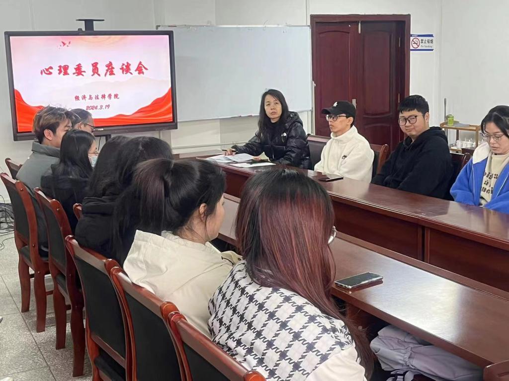 为保障学生心理健康,充分发挥心理委员在学院心理健康教育工作中的作用,3月19日,经法学院于博识楼A313会议室召开心理委员座谈会。学院党委副书记张国华、学办主任齐艳萍以及2021-2023级共计20名心理委员参加了此次座谈会。