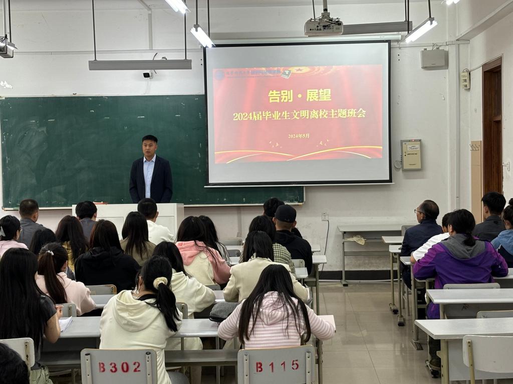 班会伊始,学院2024届毕业班辅导员张鹏飞回顾了同学们在校期间的成长变化,肯定了他们勤奋好学、积极进取的学习和生活状态,并就毕业生考研、就业等未来发展问题进行了交流和解答。他表示,希望毕业生们在未来的工作和生活中能够继续发扬昂扬向上的精神,热爱母校,以校为荣,为社会做出更大的贡献。张鹏飞强调了文明离校的重要性,并通过讲解相关政策和规定,引导毕业生们以文明、有序的方式告别母校。他详细阐述了保持宿舍卫生、爱护公共设施、遵守交通规则等方面的具体要求,表示希望毕业生们能够以身作则,为学弟学妹们树立良好的榜样。随后,张国华作总结发言。他向即将离校的毕业生们表达了深深的祝福和美好的期望,并强调,文明离校不仅仅是一种形式,更是一种责任和担当,希望毕业生们能够以实际行动践行文明离校的理念,将母校的美好传统和精神风貌传承下去。张国华鼓励毕业生们时刻保持感恩之心,感谢母校的培养和关怀,感谢老师们的辛勤付出和教诲,同时在未来的工作和生活中注重自我提升和成长,不断学习和进步,勇于创新和突破,努力实现自己的人生价值。最后,班会在一片温馨、和谐的气氛中圆满结束。毕业生们纷纷表示,在此次班会中感受到了母校的温暖和关怀,通过班会更加坚定了对未来的信心,收获了继续努力拼搏奋斗的动力,并表示未来将以更加饱满的热情和更加坚定的步伐迈向新的人生阶段,为实现自己的梦想而努力奋斗。