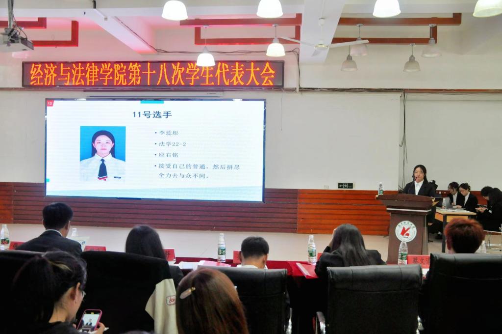 10月12日晚,经法学院于明德楼大学生活动中心召开第十八次学生代表大会。本次大会由经法学院第十七届学生会主席团成员兼办公室负责人刘爱琳主持,学院党委书记赵智博、党委副书记张国华、学办主任齐艳萍、团委副书记张鹏飞、学院团学骨干以及来自21个班级的150余名学生代表参加。本次大会共有11名同学参与部门负责人竞选,49名同学参与工作人员竞选。