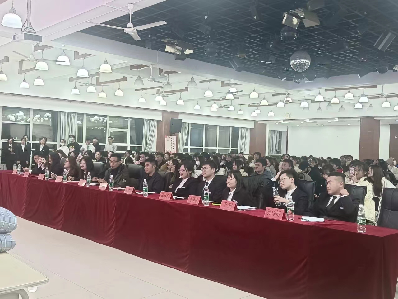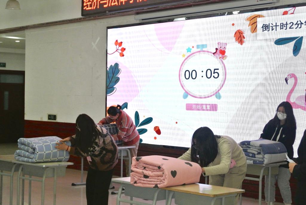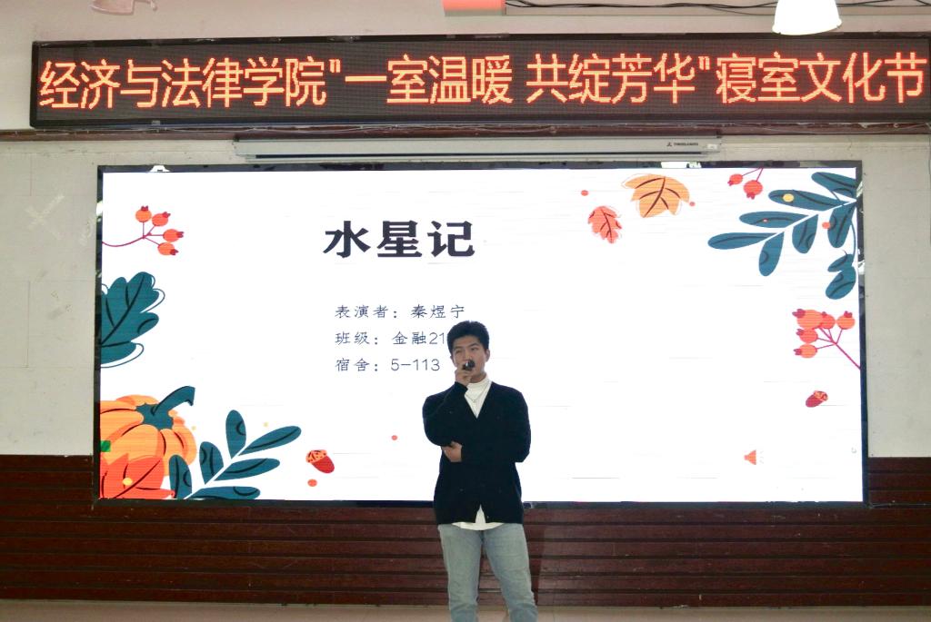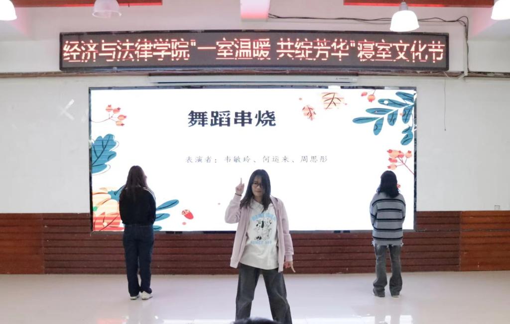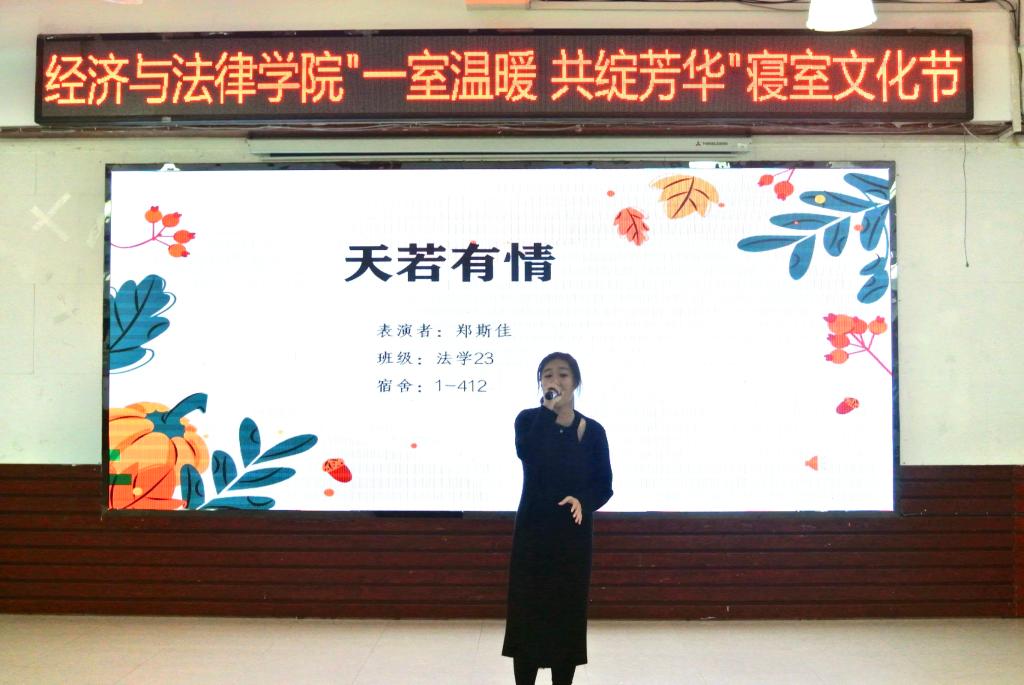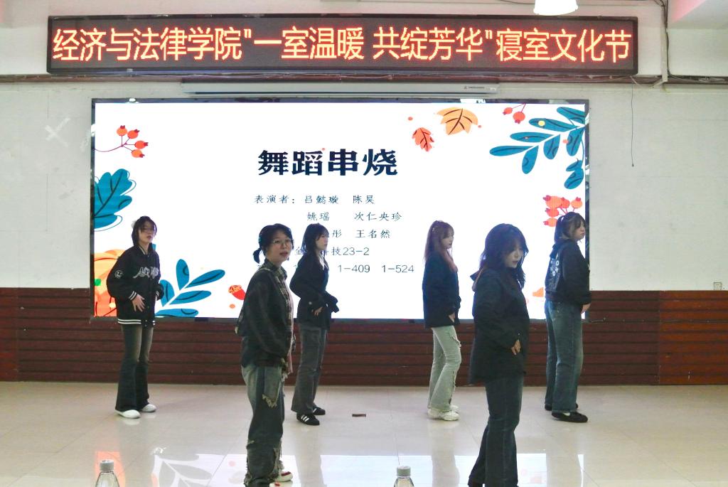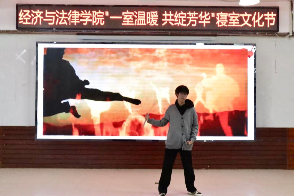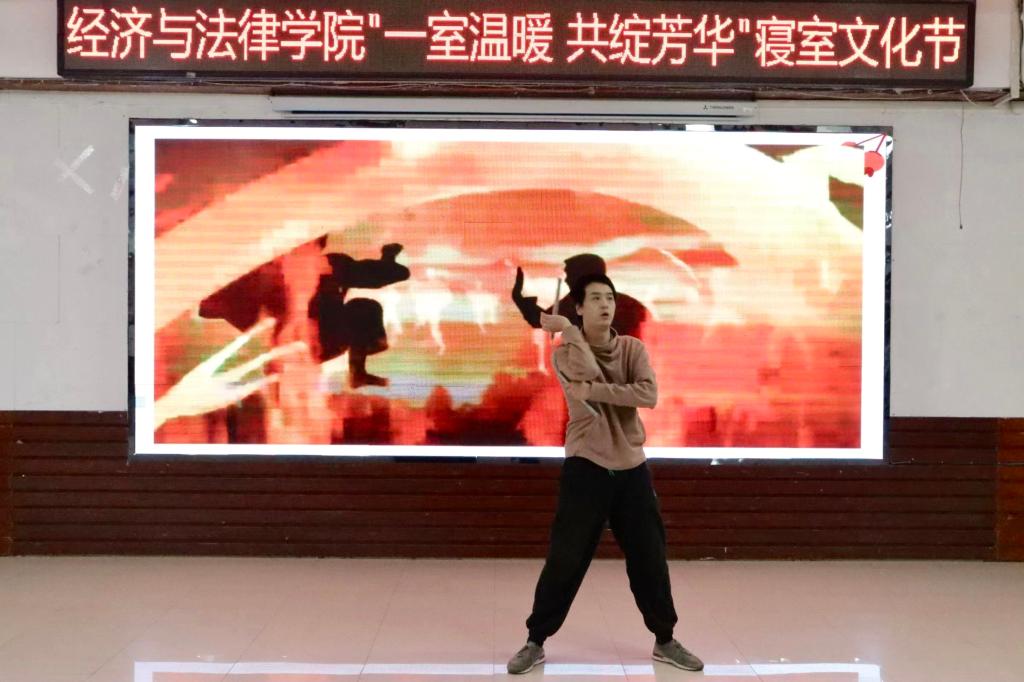 活动中,Vshow舞团开场的精彩表演点燃了观众的热情,现场气氛瞬间升温,活动正式拉开序幕。本次寝室文化节共分为“寝室vlog大赛”“才艺大赛”和“叠被子大赛”三个环节。随着全场热烈的掌声,“寝室vlog大赛”将各参赛寝室成员们精彩纷呈的寝室生活呈现在观众眼前。选手们通过照片、视频、采访等各种各样的形式记录了寝室成员之间的点点滴滴,展现了寝室生活的温馨日常以及各寝室成员们独特的闪光点。“才艺大赛”上,选手们各显神通,给观众带来了一场视听盛宴。小品《勇闯301》以诙谐的剧情、滑稽的动作让现场笑声不断;歌曲《年轮》、诗朗诵《面朝大海,春暖花开》、舞蹈串烧等表演以充沛饱满的情感诠释了经法学子们积极向上、意气飞扬的寝室风采,体现了寝室成员们热情奔放的精神面貌,赢得了在场老师和同学们的阵阵掌声。修明武术协会和金融21班秦煜宁的串场表演以及“抱团游戏”将气氛再次推向高潮,现场欢呼喝彩声不断。“叠被子大赛”环节中,随着主持人一声令下,参赛同学迅速进入状态,即便两位主持人不断提问干扰,选手们依然细致认真地整理被子,现场气氛热烈,欢呼不断。两分钟后,一块块棱角分明的“豆腐块"展现在观众面前,赢得了观众的热烈掌声。由韦敏玲、何运来、周思彤为大家带来的舞蹈串烧,表演精彩绝伦,令人印象深刻。