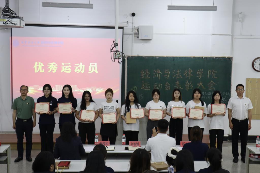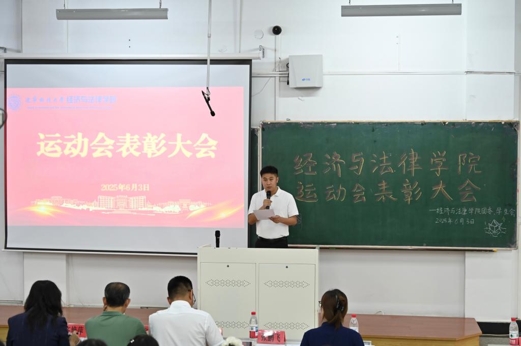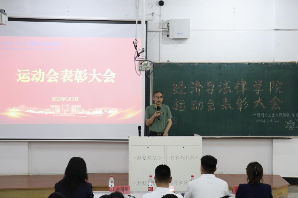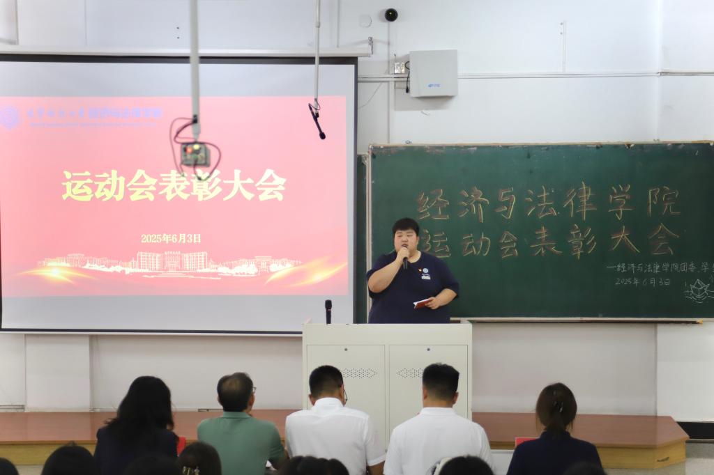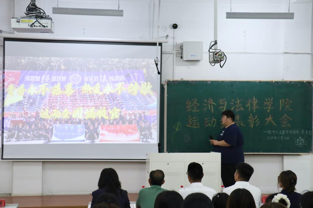6月3日,经法学院于博学楼C102召开第五十三届运动会表彰大会。会议由学院学生会主席团成员刘家辉主持,学院党委书记赵智博、党委副书记张国华、学办主任齐艳萍、团委副书记张鹏飞出席会议,学院全体团学骨干及运动员近200人参加会议。