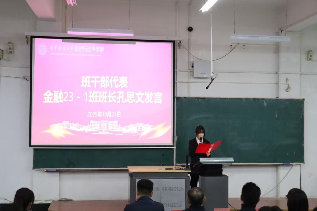 在学生干部表态发言环节,学生会执行主席申佳鹭以“做学风建设表率”为主题发言。她表示,学生干部应以学为先,夯实成长根基;以用为本,提升综合能力。金融23-1班班长孔思文结合连续两年获评“优良学风班”的经验,分享了学风建设的具体做法:以积极向上的班训为引领,搭建多元学习平台,由班委带头、全员参与,共建优良学风。