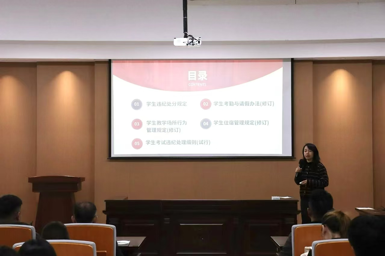 学办主任齐艳萍针对学生规章制度、校园纪律、学生处分事宜、请假流程及考勤管理等方面进行了详细讲解。她着重强调了学生骨干带头遵守学生行为准则的重要意义,并要求全体同学务必遵守校园各项纪律规定,共同维护良好的校园秩序。