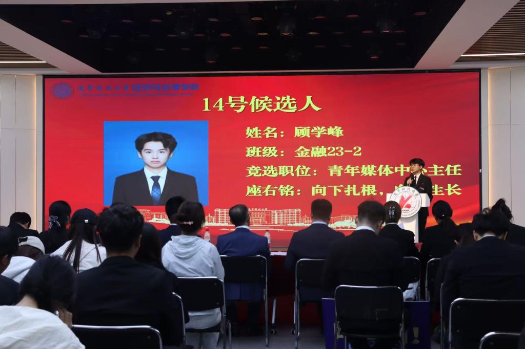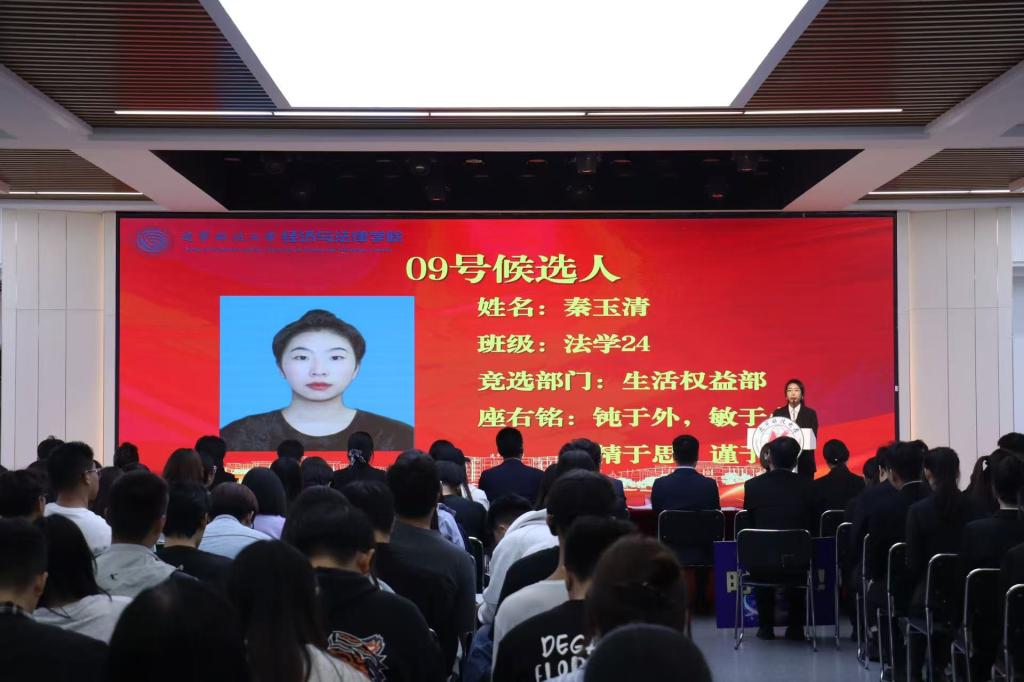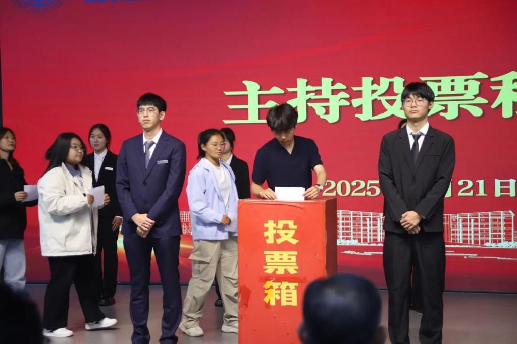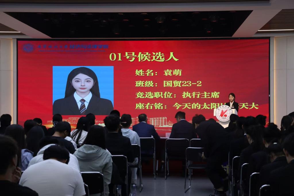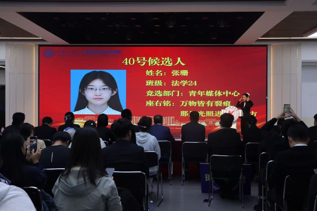 在竞选环节,候选人依次登台发表演讲,围绕个人经历、竞选初心和未来规划等方面进行阐述。演讲现场气氛热烈,多位候选人提出了切实可行的工作设想:有的着力于推动学术交流与思想引领,有的强调丰富校园文化与志愿服务,有的则提出完善信息反馈机制、拓展跨院合作与社会实践机会。大家还结合新媒体传播优势,提出要打造更具影响力的学院品牌形象。真挚的表达和饱满的热情赢得阵阵掌声,充分展现了经法学子积极进取、勇于担当的青春风采。大会采用不记名投票的方式,严格遵循公平、公正、公开的原则进行差额选举。