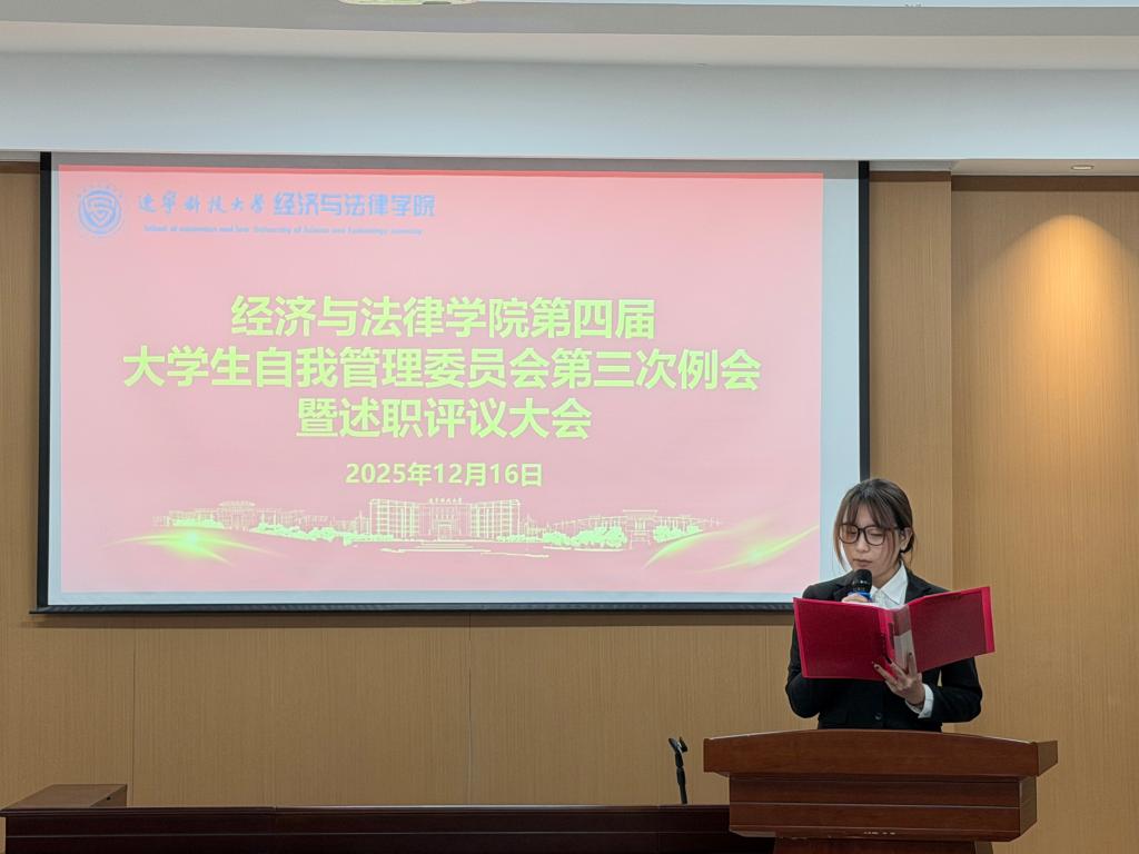 12月16日,经法学院于博识楼A402召开第四届大学生自我管理委员会(以下简称自管会)第三次工作例会暨述职评议大会。学院学办主任李路云出席本次大会,会议由经法学院自管会执行主席刘鑫喆主持,第四届自管会全体成员参加了本次会议。