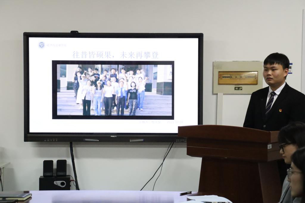 首先进行的是优良学风班答辩,共有来自3个年级的7个班集体参与评比。各班班长围绕思想引领、学业成绩、科创实践、班级文化四个维度,以PPT的形式对班级风采进行展示。从学业提升到文化塑造,从实践成果到创新探索,汇报内容既有数据支撑,也展现了班级建设的温度与创意。学院党委副书记张国华进行点评,他充分肯定了各班班委在学风建设和组织管理方面取得的成绩,并强调“学风建设贵在平时”。他指出,班干部要在日常学习管理中抓实考勤、组建学业帮扶小组、降低挂科率,同时要发挥学生干部的示范引领作用,以点带面形成合力,进一步增强班级凝聚力,为培养高素质经法人才夯实基础。