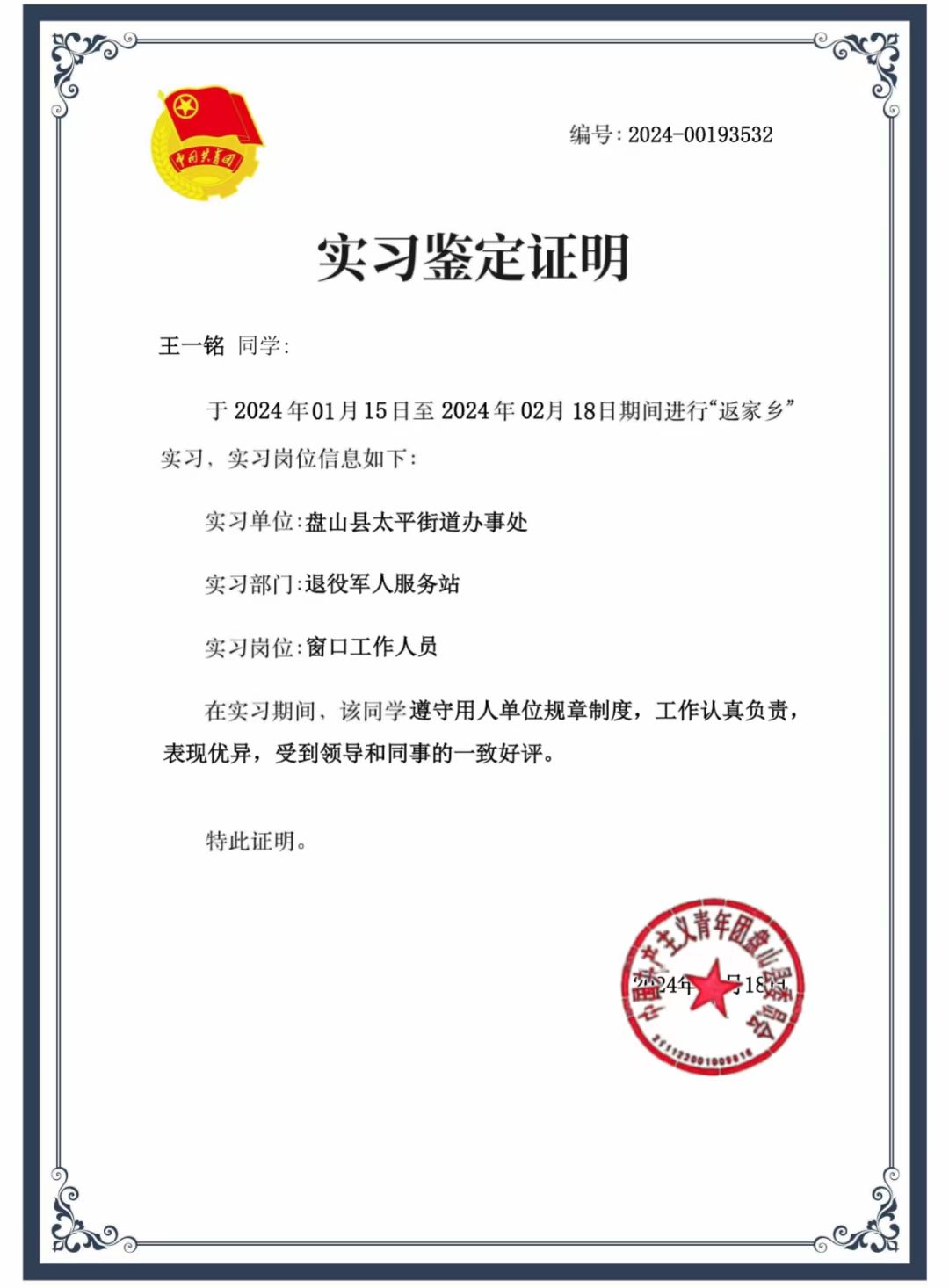 王一铭,男,共青团员,现任法学23班团支部书记兼副班长。2024年寒假期间,该生践行初心,积极奉献,在盘山县太平街道办事处退役军人服务站实习工作,主要负责协助处理退役军人的来访咨询、资料整理以及相关政策的宣传工作。