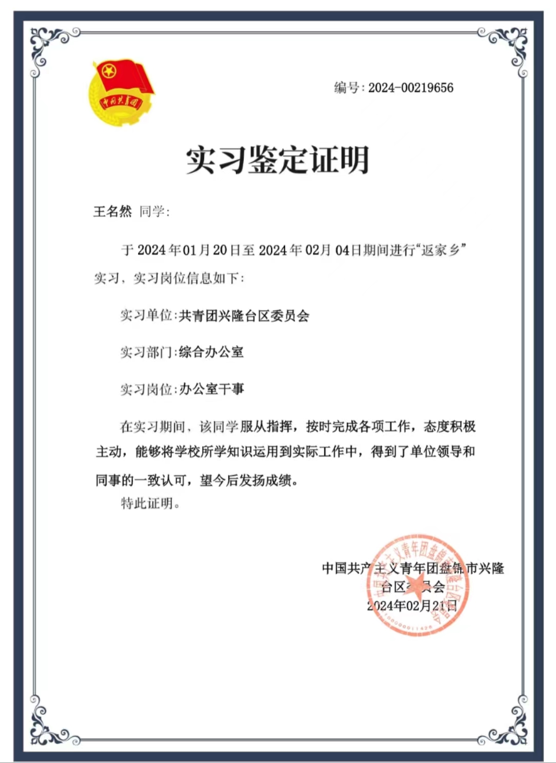 这次寒假的实践之旅,是一场拓展人生的实践之旅。作为一名“返家乡”的大学生志愿者,有幸被兴隆台区团委录用,在综合办公室担任干事一职,主要负责的工作是整理信息、活动策划、发布通知等工作,期间还参加了兴隆台区中小学冬季研学营的活动全程,在活动期间,我主要负责带领中小学生在每一个研学地点进行学习、策划组织活动以及知识宣讲,我们本次活动也被盘锦市广播电视台报道。在此过程中,通过在办公室工作,我学会了熟练运用办公室软件,也深深地体验了带领团队一起完成任务的满足感与幸福感,希望以后还能继续参加“返家乡”社会实践活动,为家乡发展贡献出自己的一份力量!