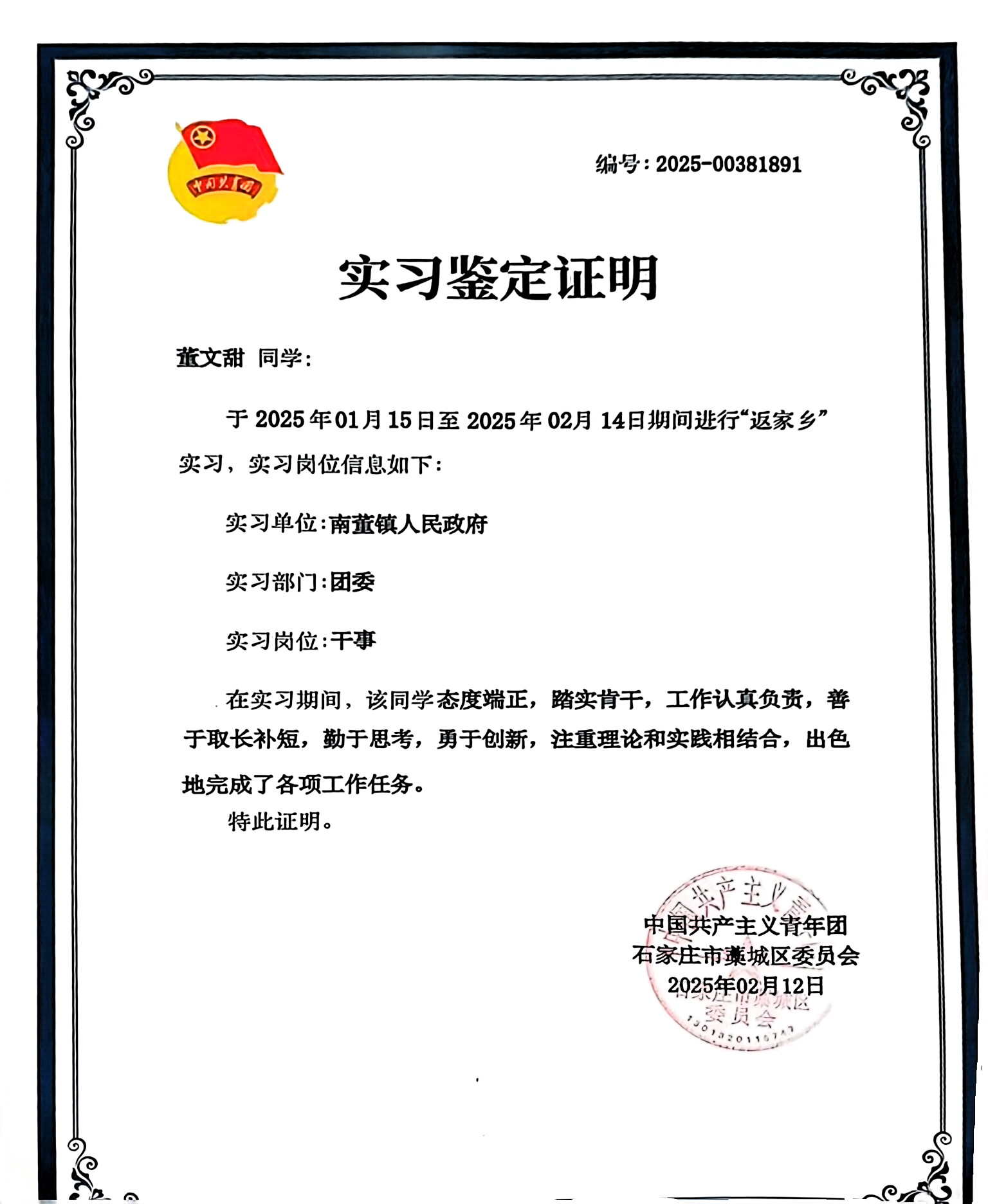 我负责文件整理与归档,把文件按年份、类别和重要性分类,初步了解了政府工作流程,认识到文件管理对政策落实和群众利益的重要性。同时参与了关爱孤寡老人和留守儿童的志愿活动,为他们提供生活物资、陪伴和功课辅导,真切感受到了基层工作的温度,也体会到政府在保障民生、促进社会和谐方面所做的努力。未来,我将带着收获的知识和感悟,不断提升自己,积极参与家乡建设,为南董镇的发展添砖加瓦,让家乡变得更加美好。